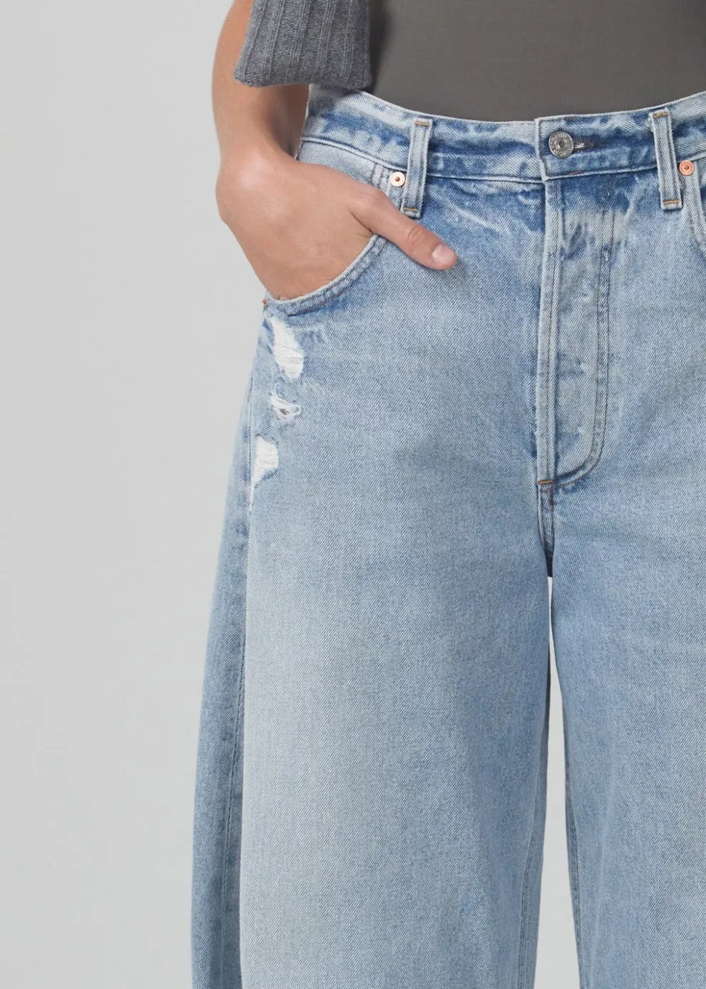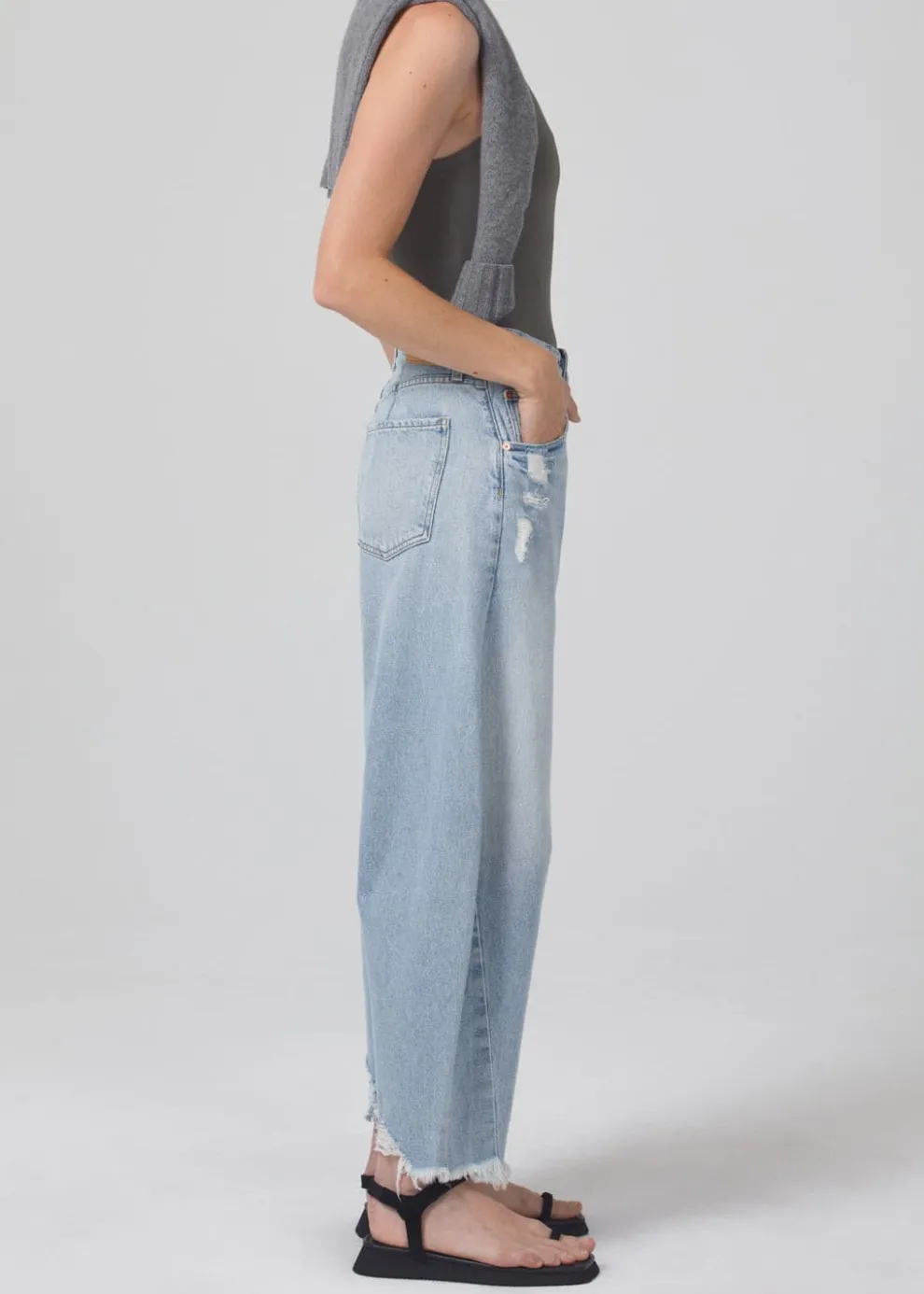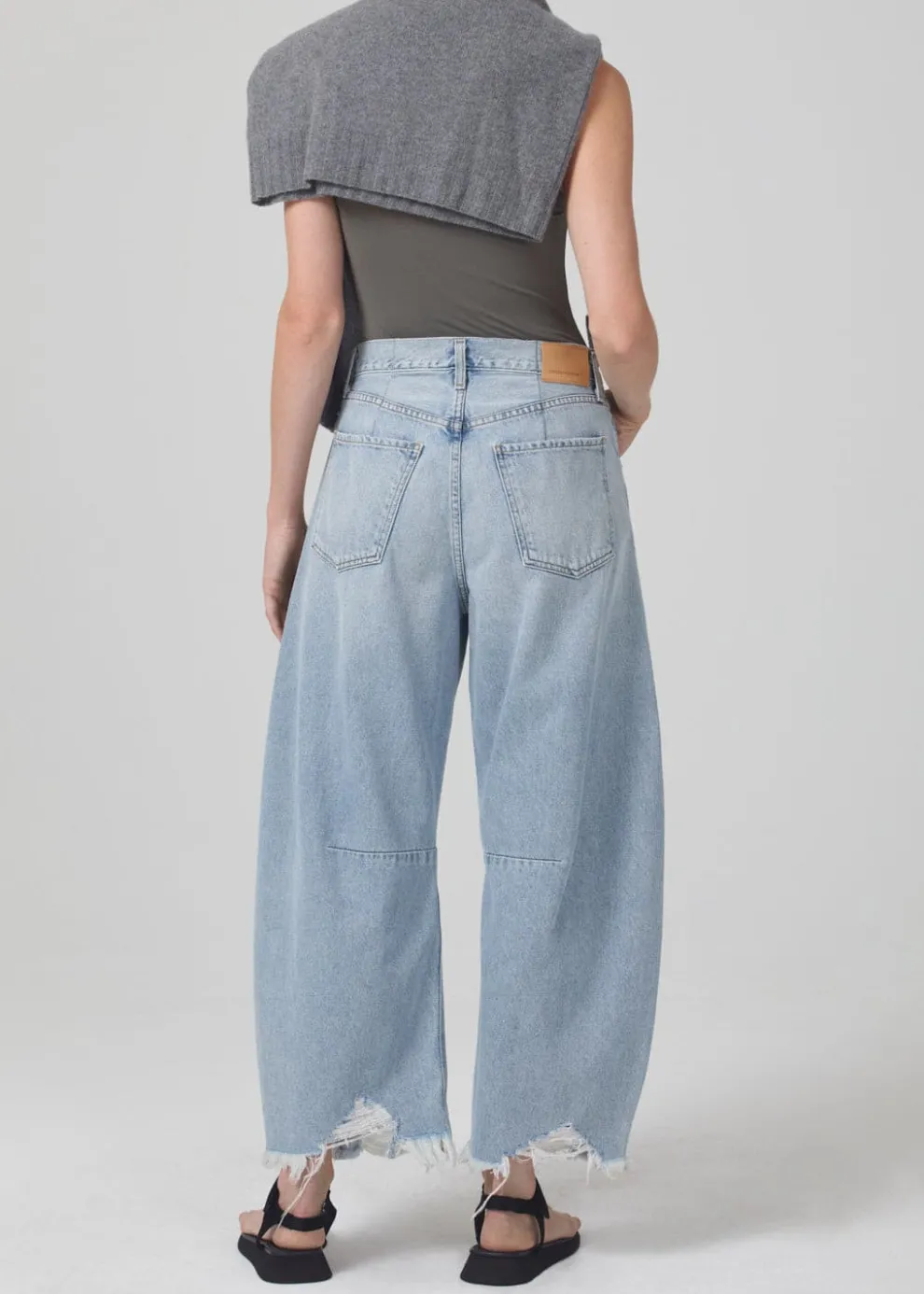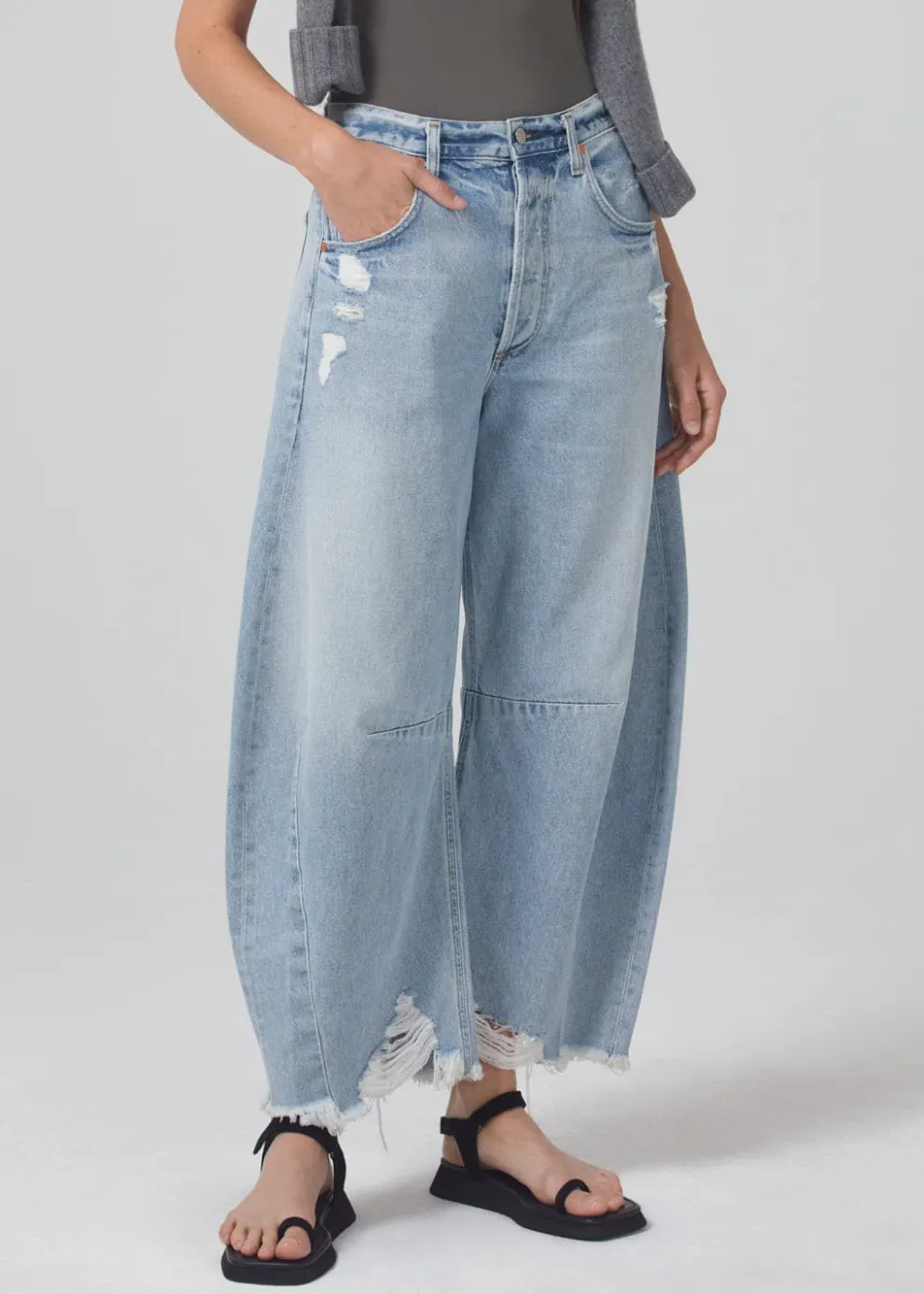 Aptly named, the Horseshoe jean is designed with a wide, curved leg with slightly tapered and cropped frayed hems.