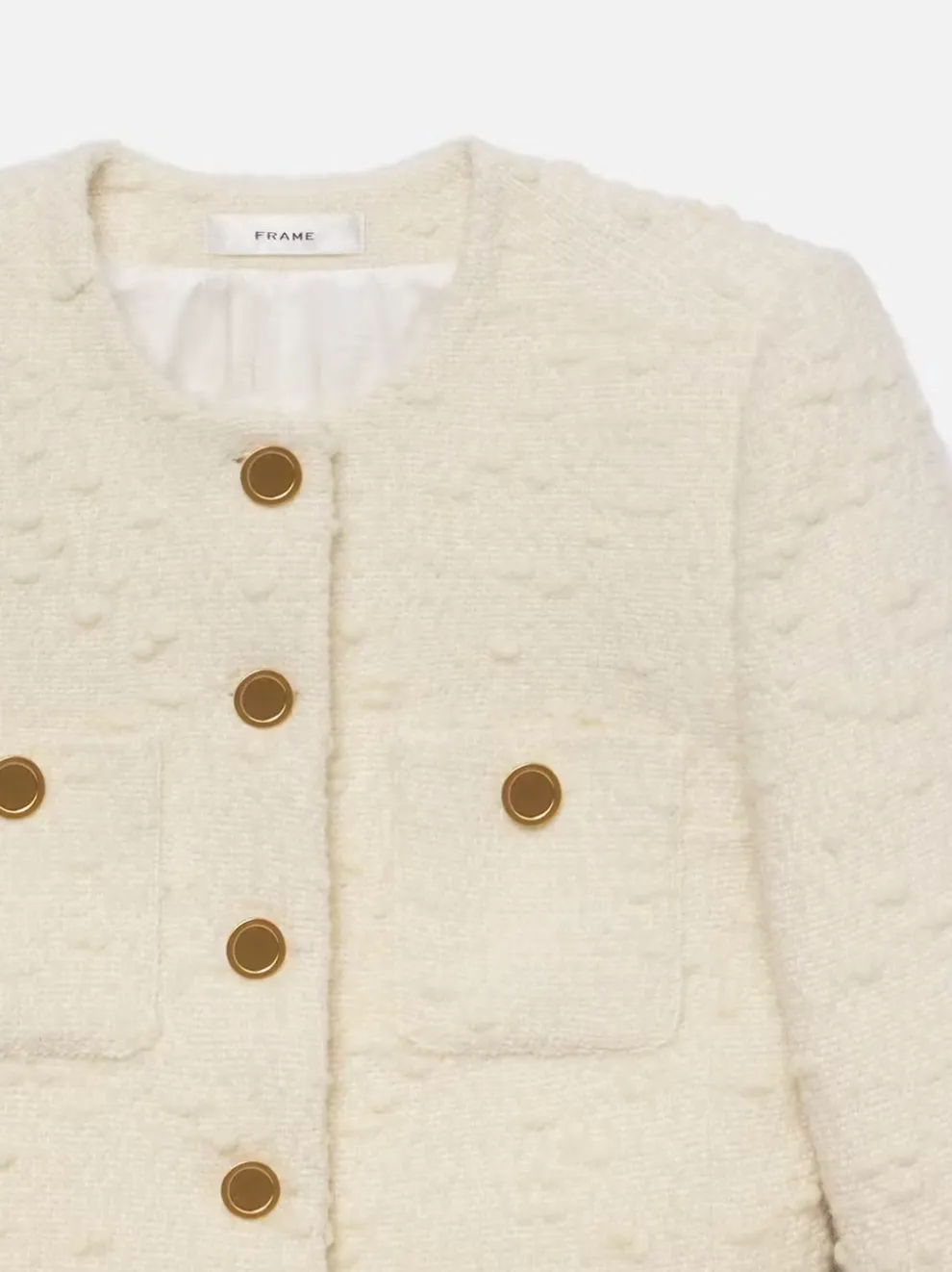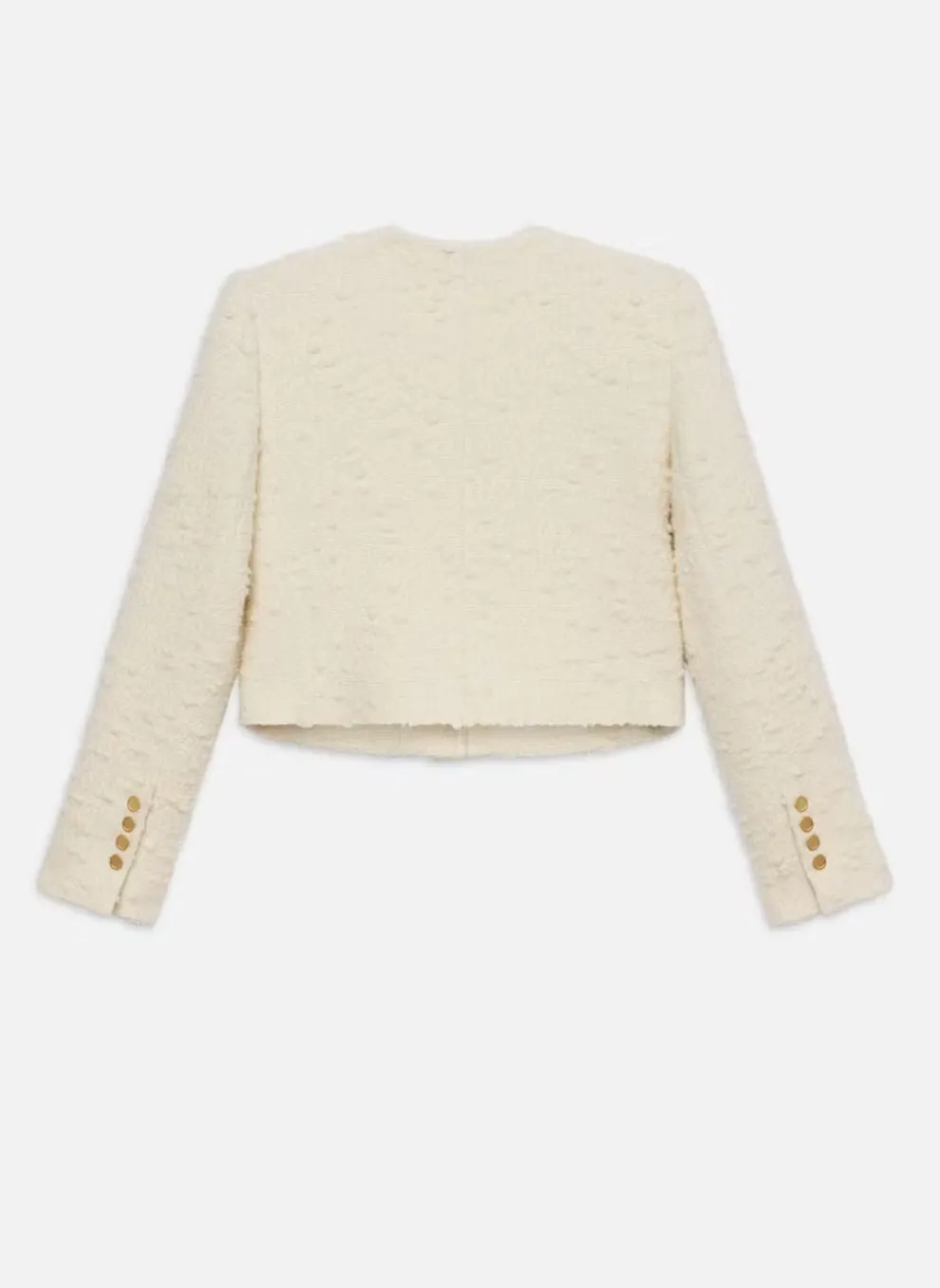 Une version revisitée de la veste de costume classique, ce modèle court sans col est doté de boutons sur le devant et de poches au niveau de la poitrine. Portez cette couche en mélange de coton et de laine texturée aussi facilement avec un jean qu’avec un pantalon.