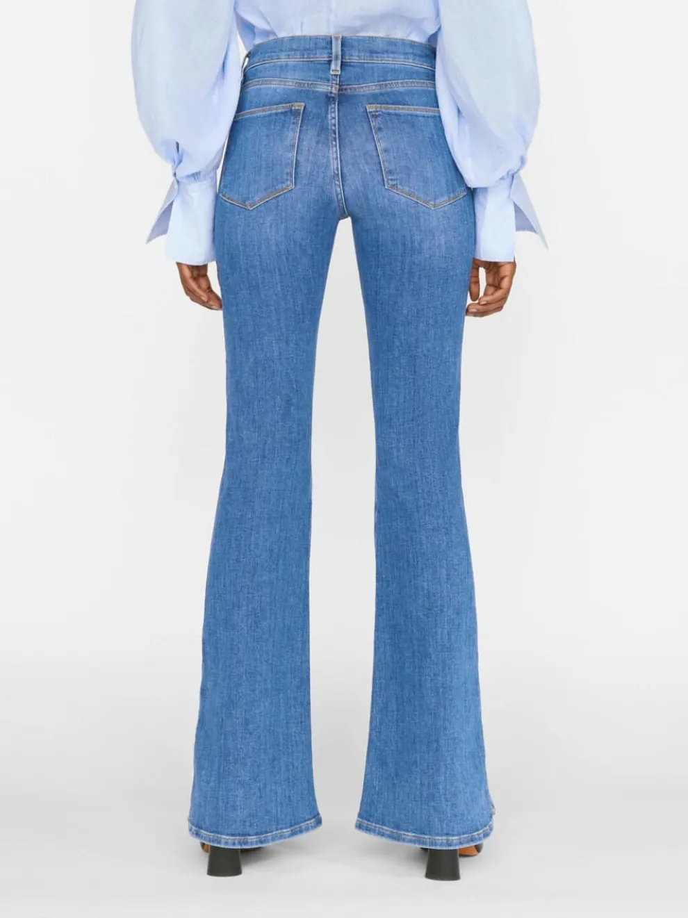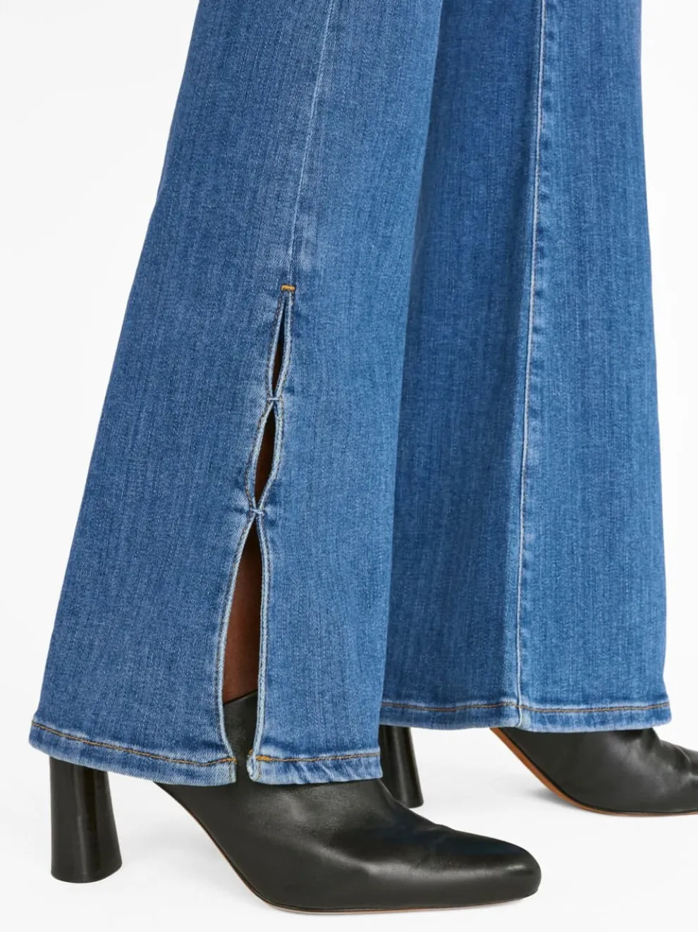 The high-rise silhouette of Le High Flare revisits the retro style. Adjusted cut at the hips and thighs, with an easy stretching that flattes all types of body and dressed with edgy-chic slits at the outer seams. . This pair is made of super stretch denim in a medium blue wash with a clean and uniform finish. Your must-have jeans for working and resting days.