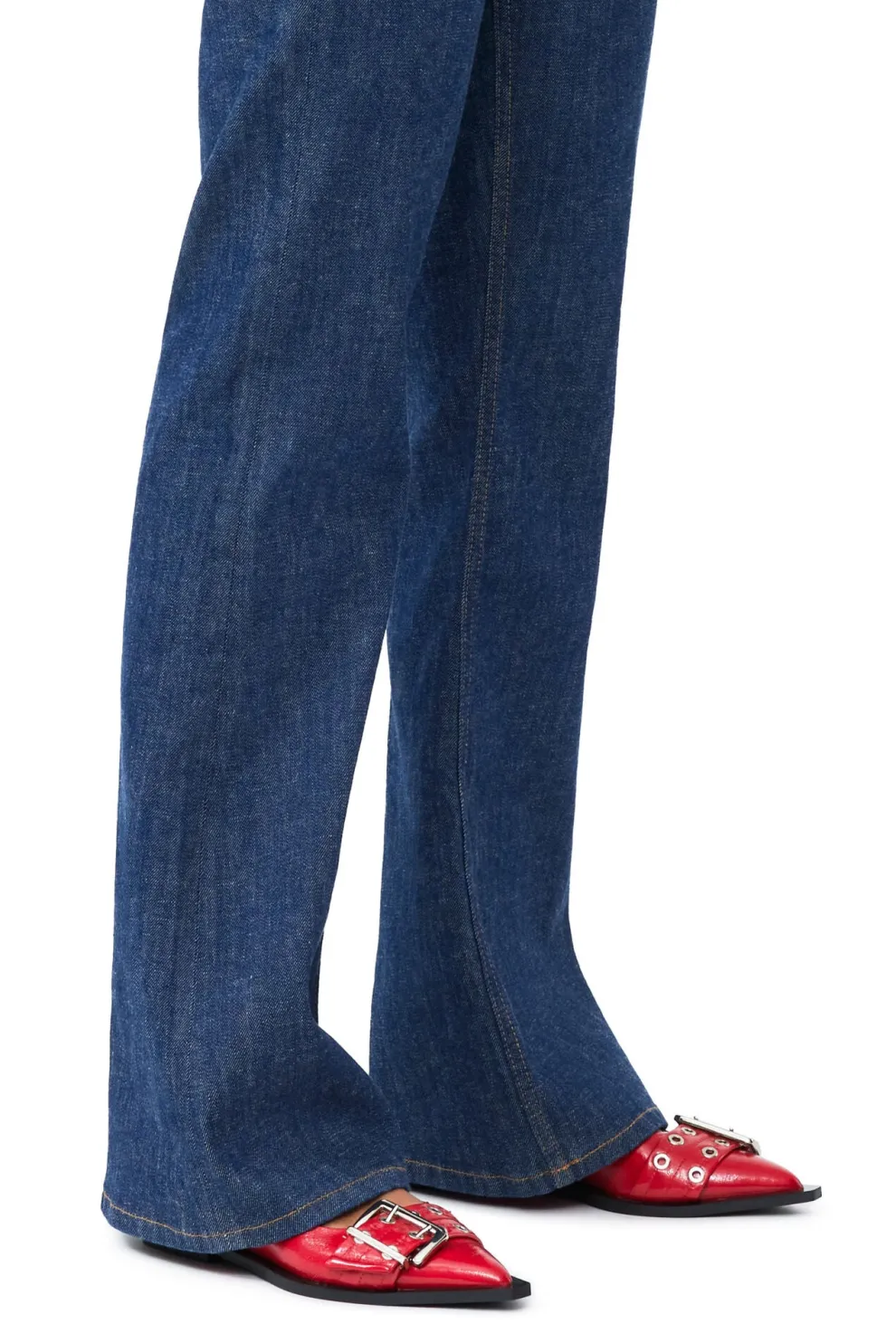 Ces ballerines rouge sont dotées d’un talon plat carré, de brides arrière, de larges boucles métalliques avec des détails d’œillets, et d’un logo GANNI gravé
