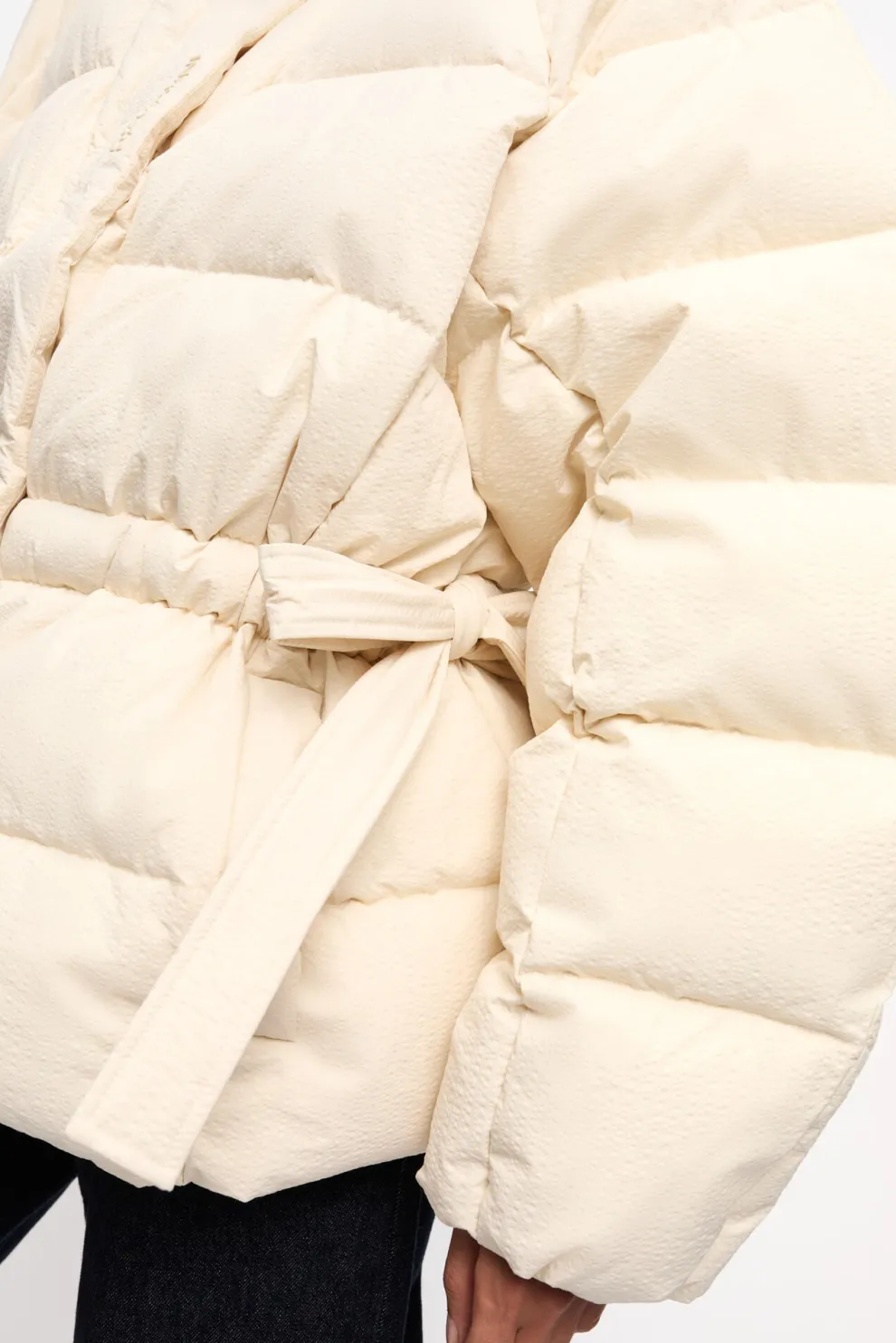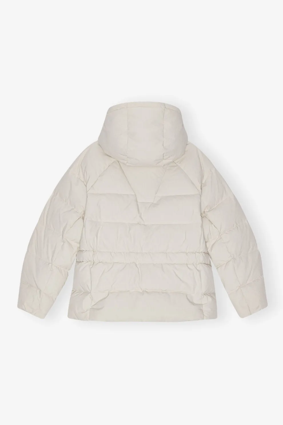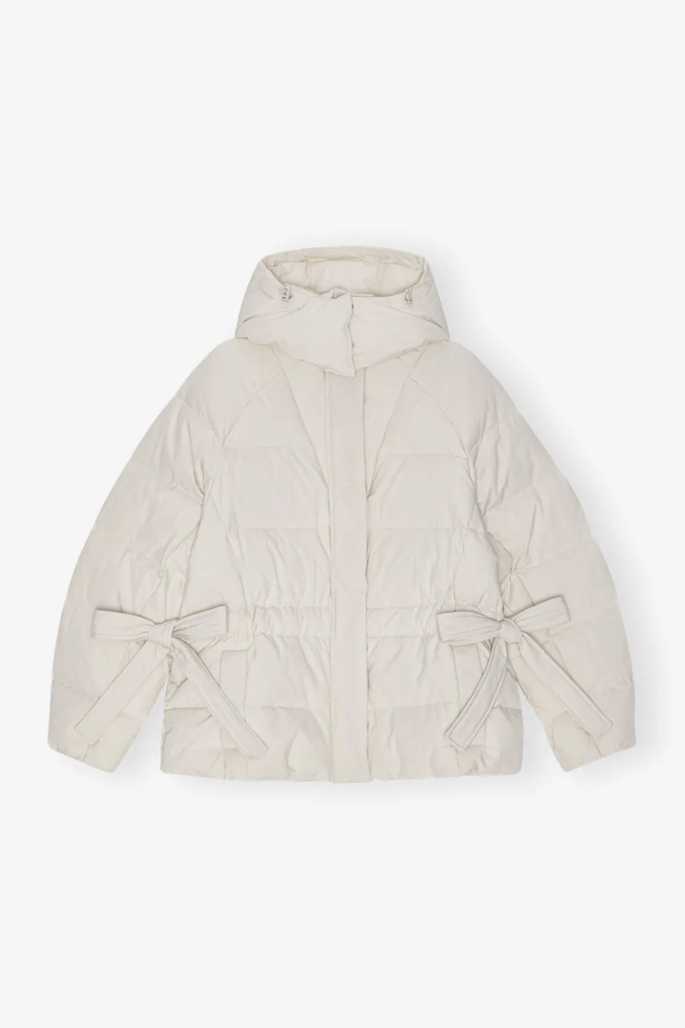 Cette doudoune technique blanche oversize est dotée d’un col montant et d’une capuche. Le manteau dispose d’une fermeture éclair sur le devant avec une patte dissimulée, de liens réglables à la taille et de poches latérales.