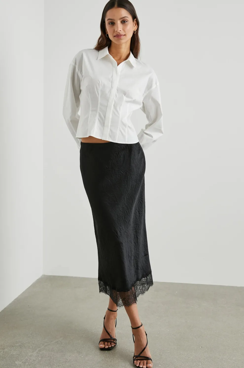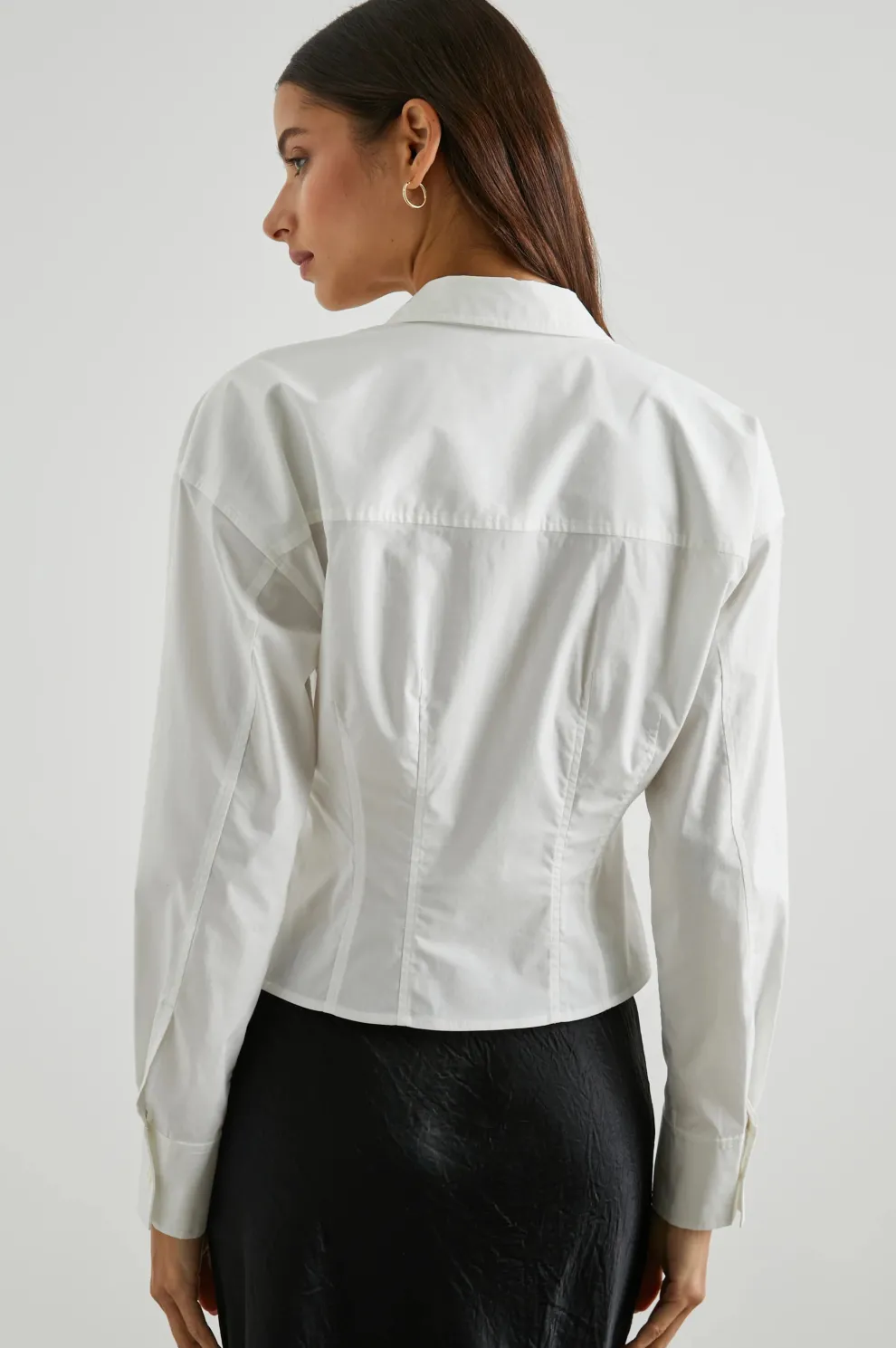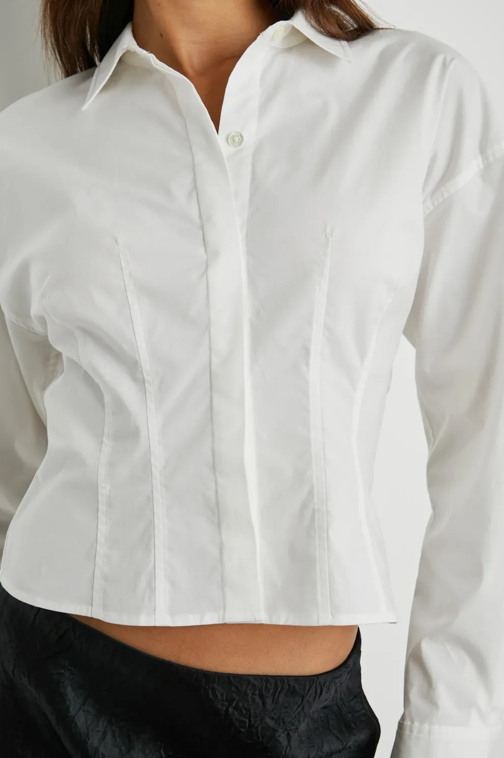 A traditional button closure with a sophisticated twist. The Anabelle will become your preferred choice, whether it is to start your day in the conference room or to go to the bar. Crafted from a stretch poplin fabric, this shirt features a structured vertical pleat that flatters the figure on any occasion.