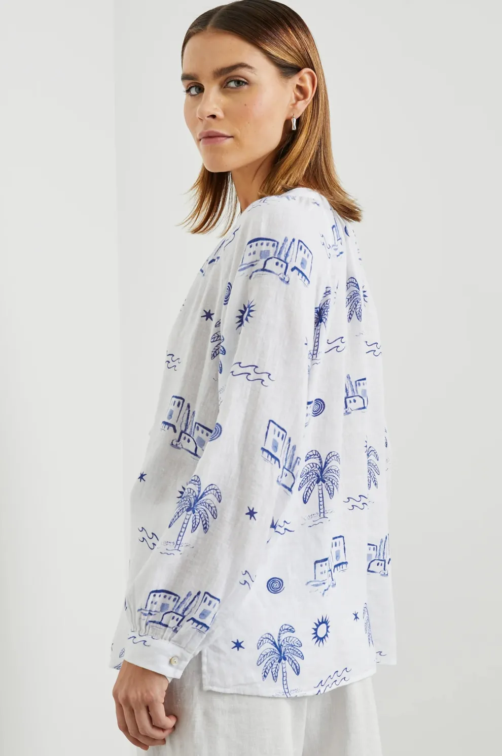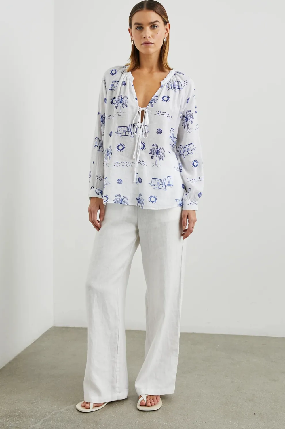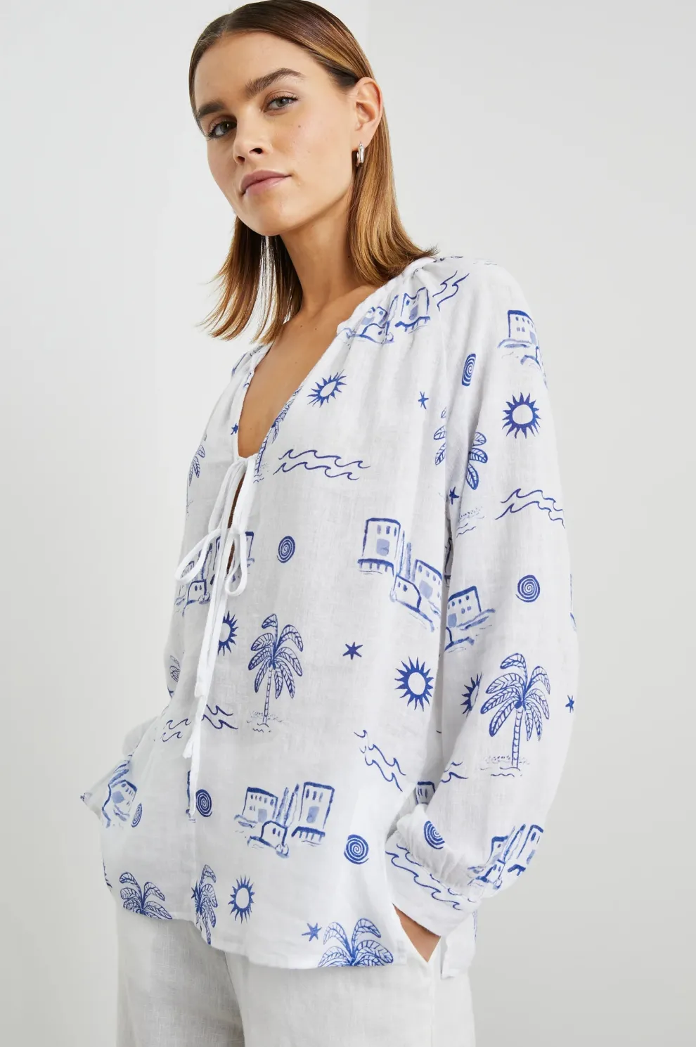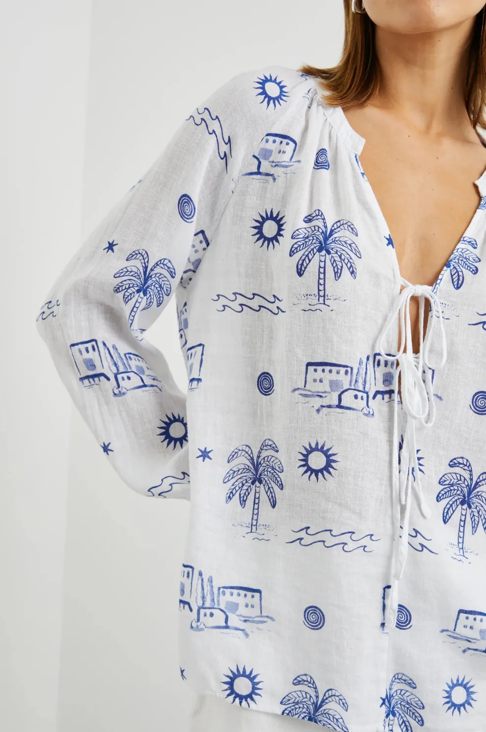 Évadez-vous vers la Méditerranée avec le haut Brielle, arborant un imprimé inspiré de Mykonos peint à la main. En lin luxueux ultra-léger avec des fermetures à nouer à l’avant, ce haut peut être assorti le pantalon Ryan pour compléter le look.