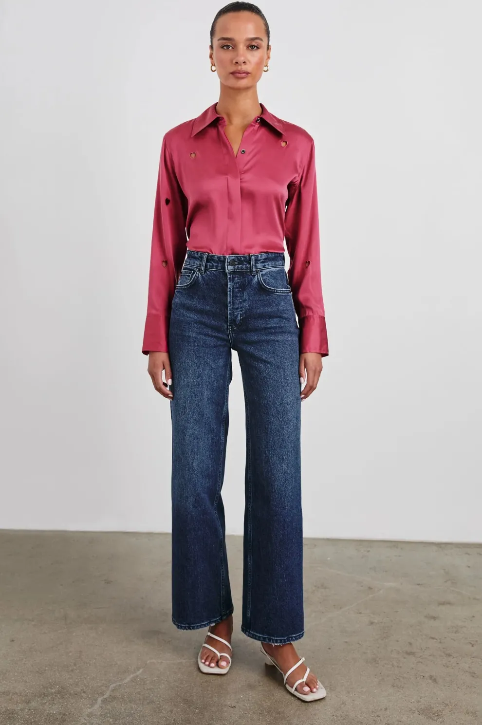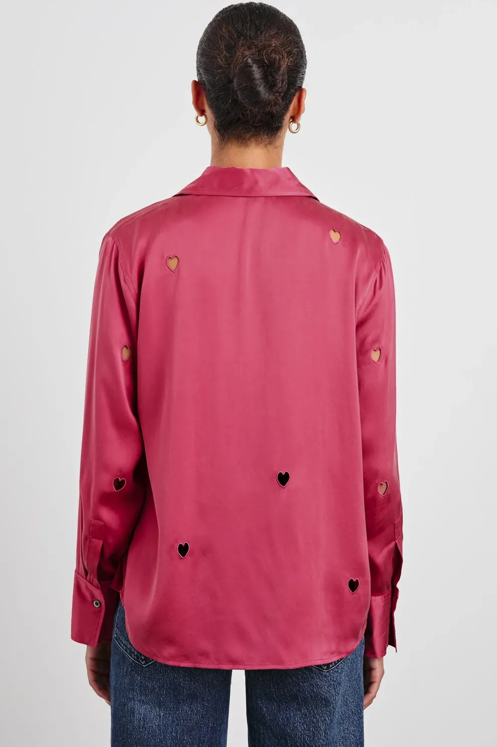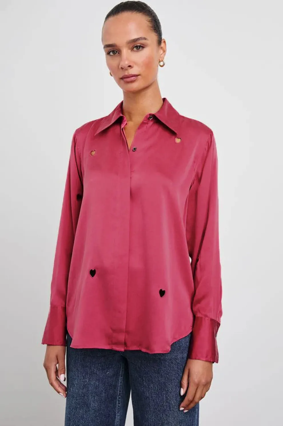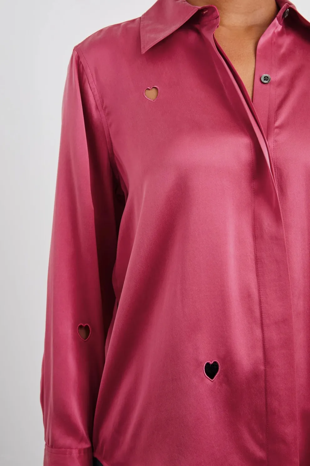 Une chemise ultra-légère à manches boutonnées qui offre du style avec une touche de découpes en forme de cœur et une soie charmeuse souple. Portez-la avec votre jean préféré ou glissez-la dans une jupe taille haute pour un style sans effort du bureau au week-end.