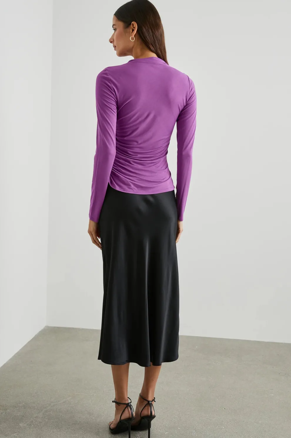 The Joelle top is a modern interpretation of the long-sleeve classic. Made from a soft, lightweight jersey, this style features an asymmetrical stand-up collar with ruched detailing from the right shoulder.