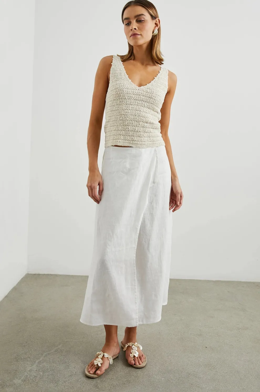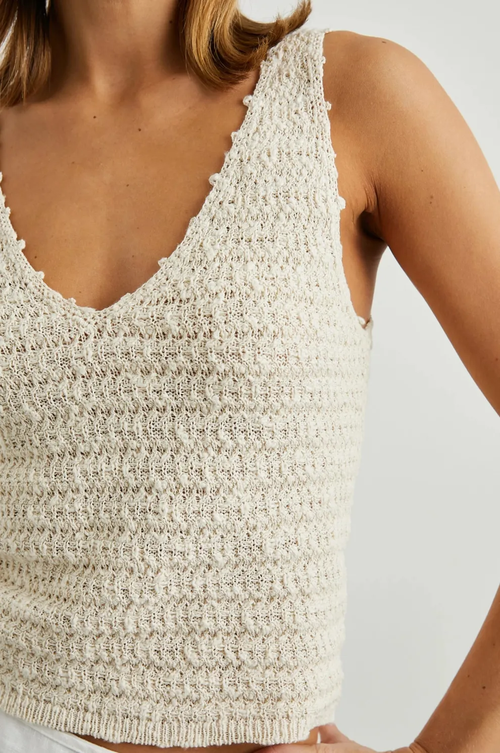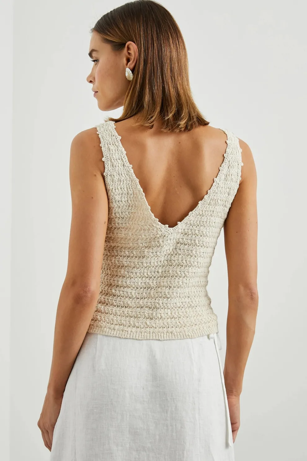 Le haut Matilde est confectionné en coton filé. Ce tricot crocheté couleur avoine assure une texture douce et agréable à porter. Portez-le seul, avec votre jean préféré.