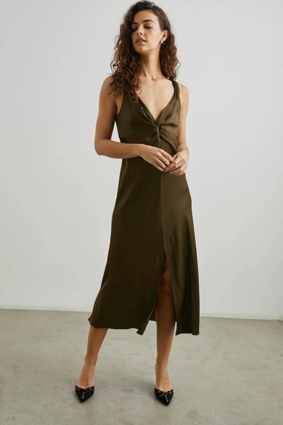 Coupée en biais dans un crêpe à dos satin souple pour une silhouette fluide, cette robe présente un décolleté en V avec un twist au centre du buste et une jupe à couture centrale.