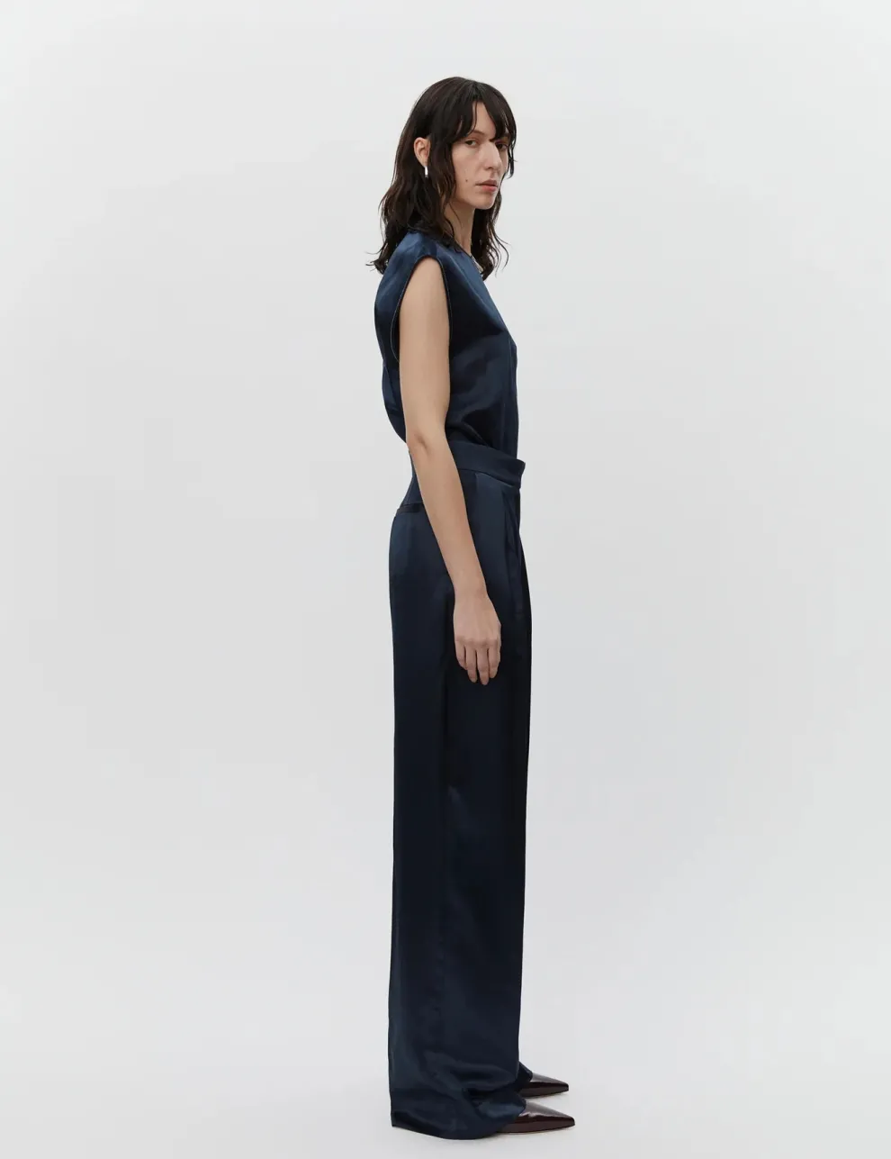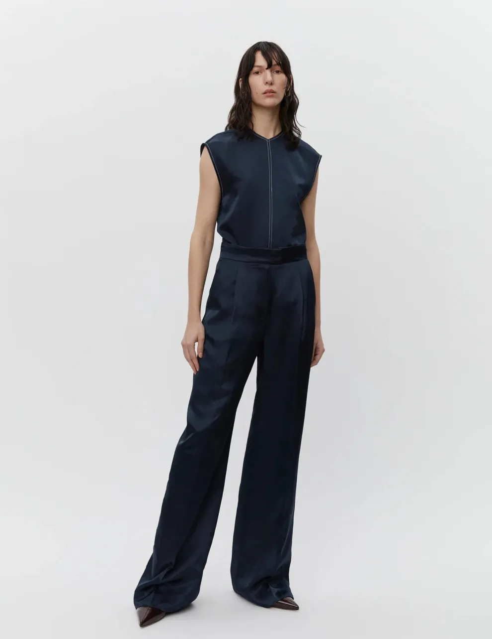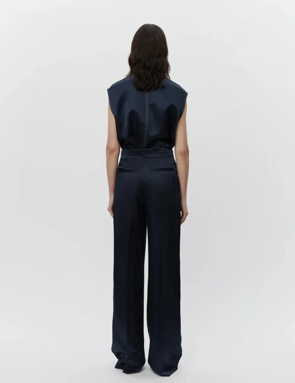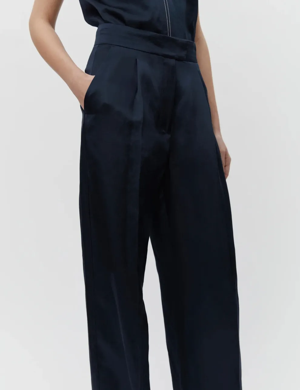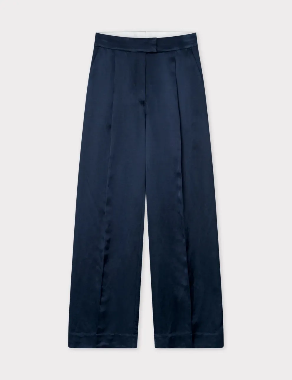 Ces pantalons à taille mi-haute et jambes larges disposent d’une braguette zippée avec fermeture à crochet, de poches latérales et de poches à l’arrière. Ils sont ornés de plis à la taille et offrent une coupe régulière.