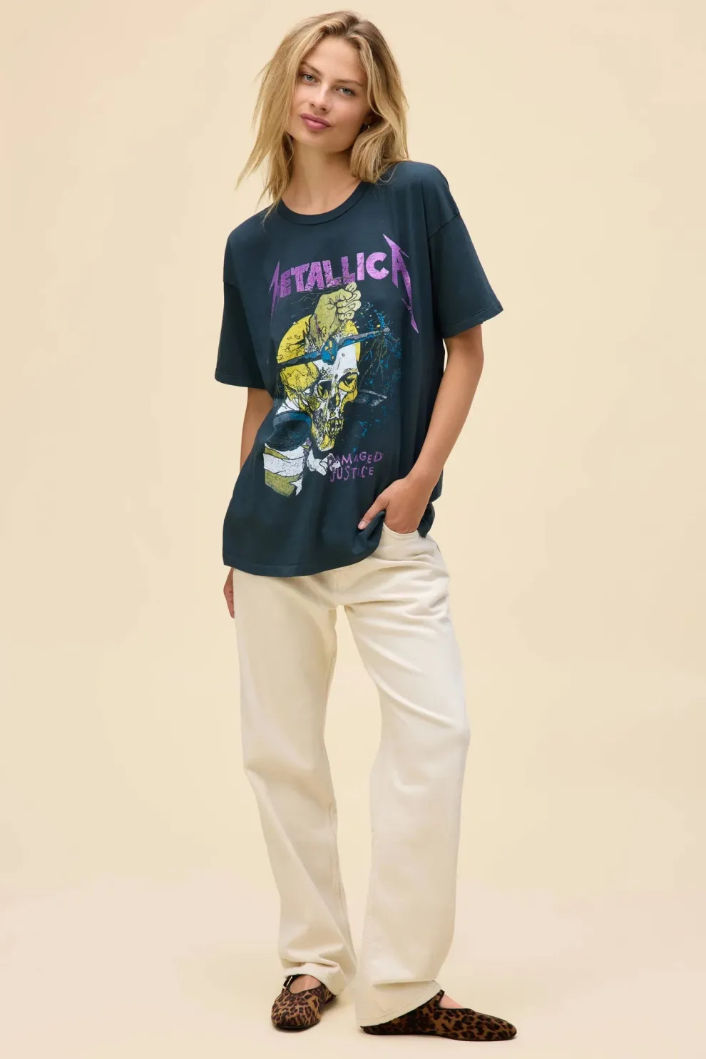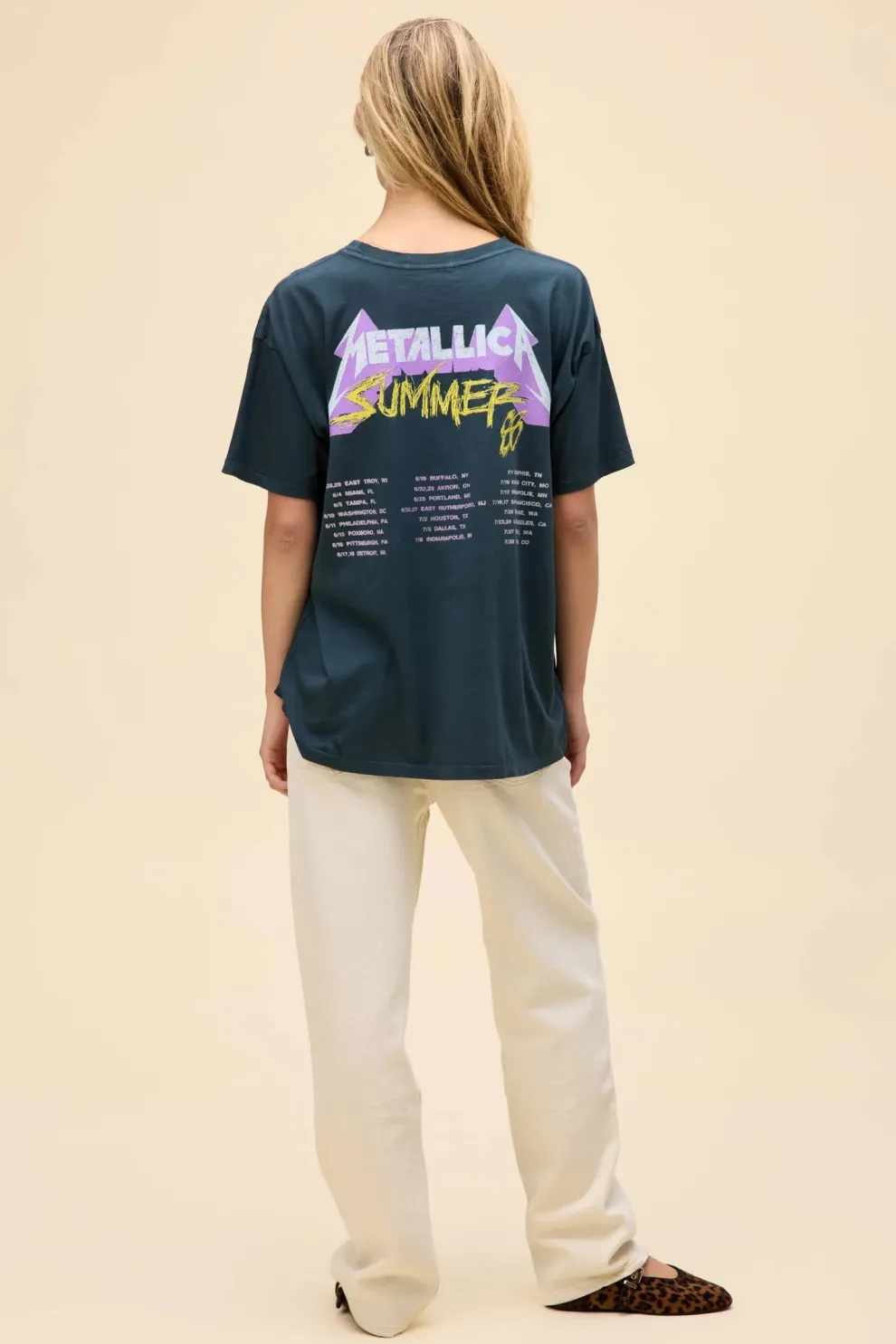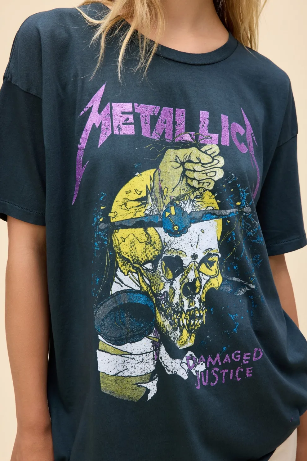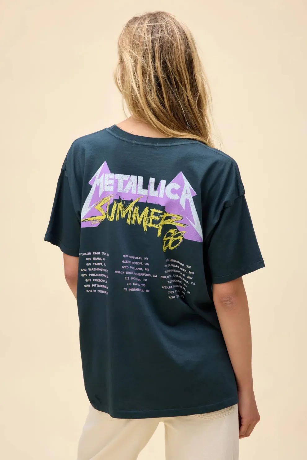 Un incontournable pour les fans de Metallica, inspiré de la quatrième tournée du groupe, Damaged Justice. Orné d’un graphique de crâne et du logo du groupe accentué d’encre pailletée, avec les détails du concert de l’été 88 estampillés au dos.