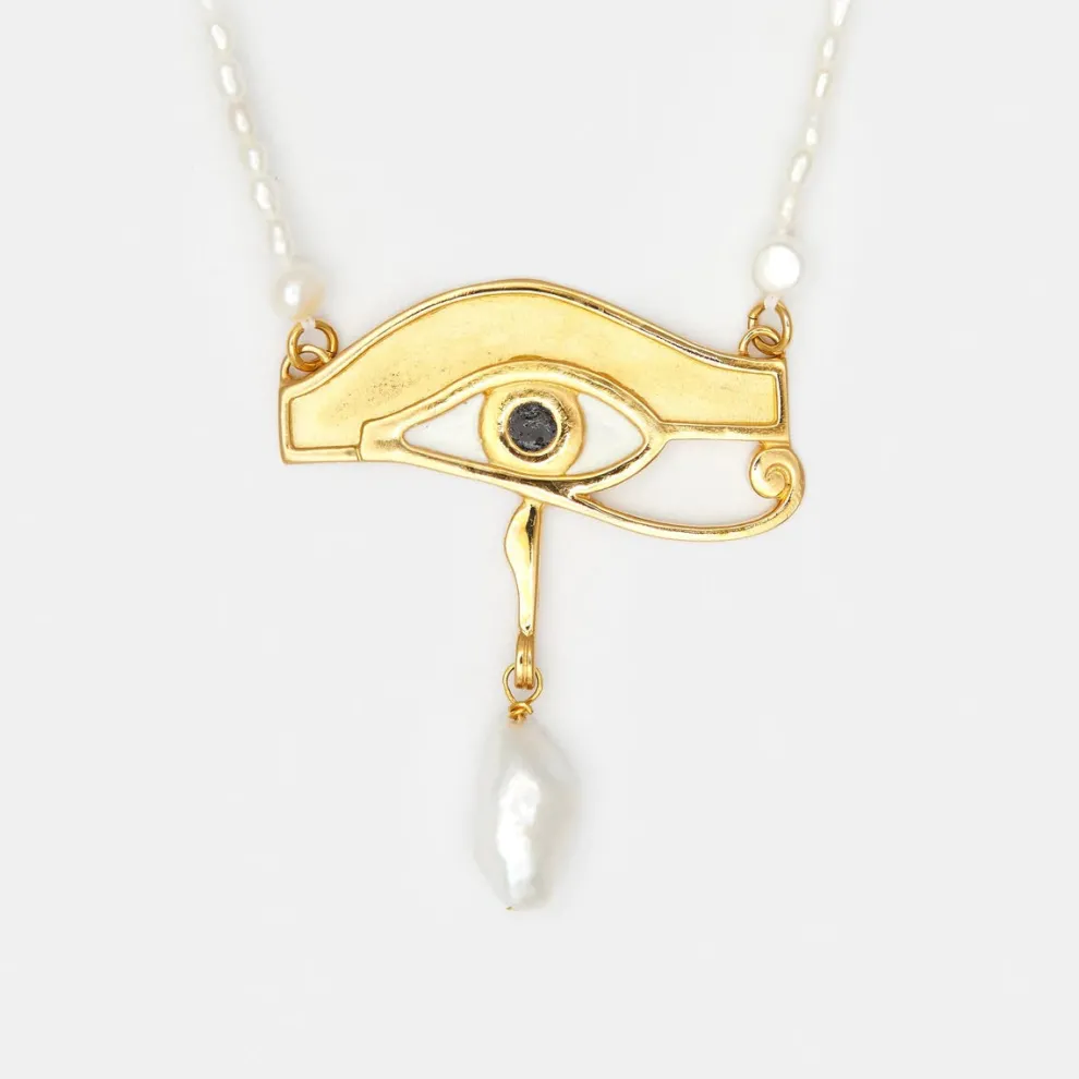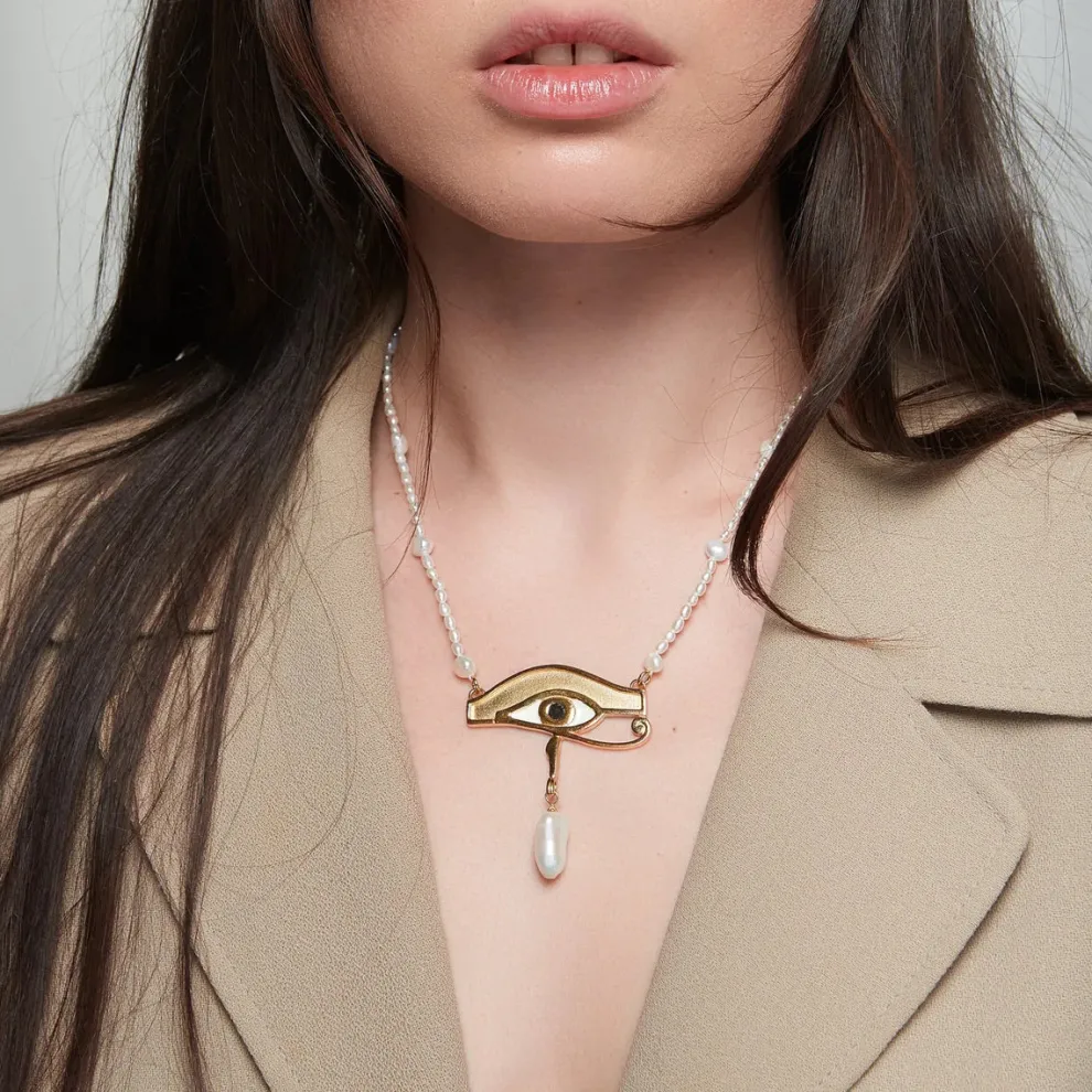 Inspired by the female goddesses from ancient Egypt, the Maryam necklace is a bold and unique piece. The golden handcrafted eye of Horus is carefully painted in resin and adorned with a tear of joy made from a naturally shaped freshwater pearl. Perfect for layering with other golden chains at the beach.