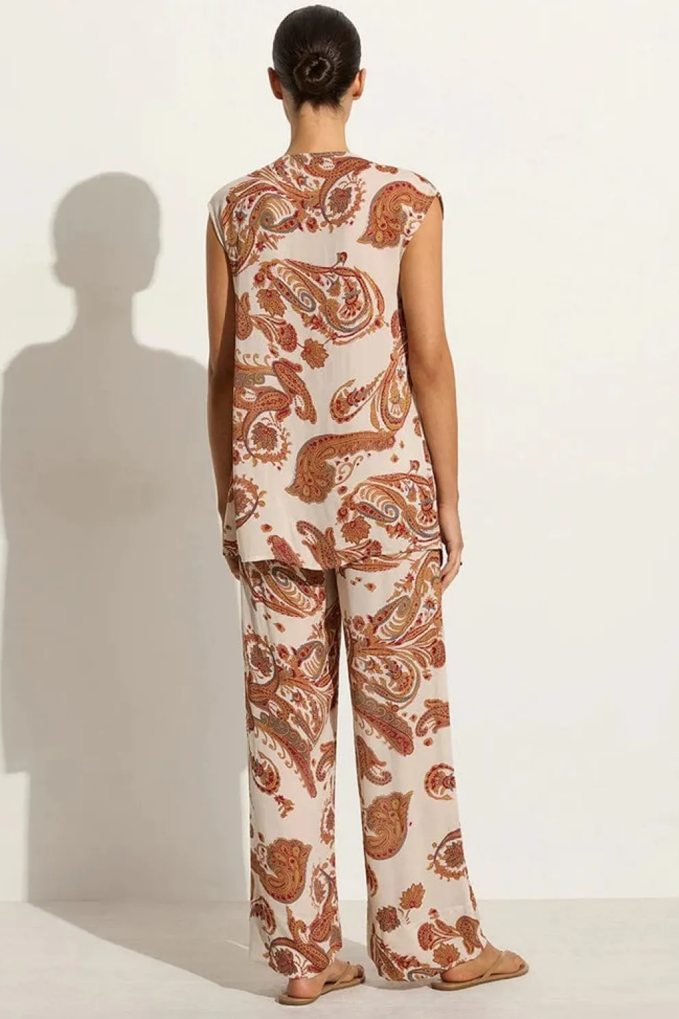 Le haut Ionica en Alessia Paisley présente une silhouette décontractée avec un décolleté en V, un design sans manches et un ourlet long facile à porter. Les liens à l’avant en font une option de couverture facile à superposer sur un maillot de bain, et s’associent parfaitement avec le pantalon Gorges.