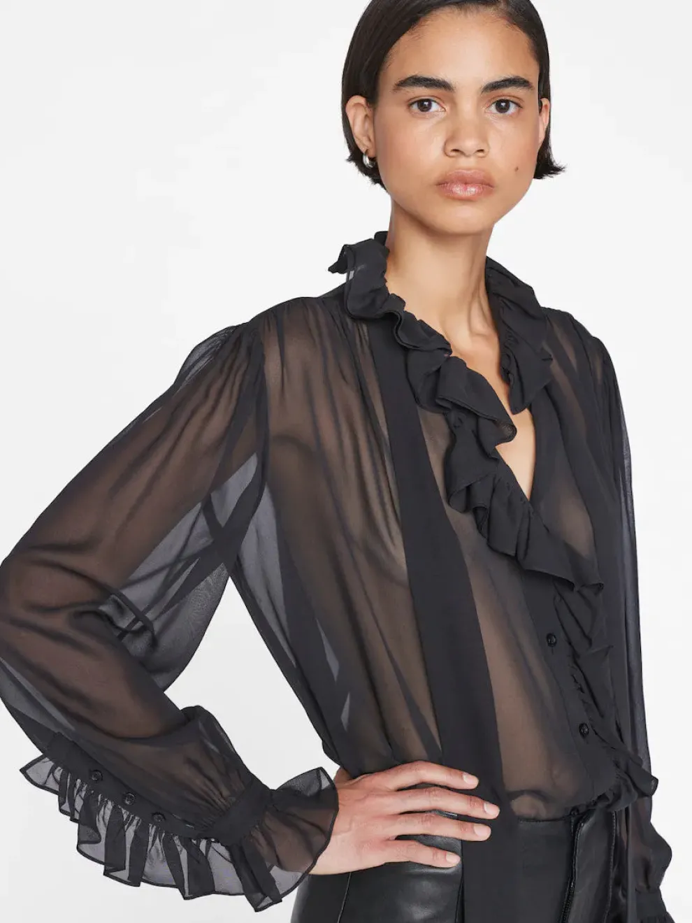 Long sleeve blouse in sheer fabric featuring a ruffled collar, a long ribbon tie around the neck, a flowing silhouette accented with ruching, a button closure, and ruffled embellishments at the front and cuffs. Made from ultra-luxurious 100% chiffon silk.