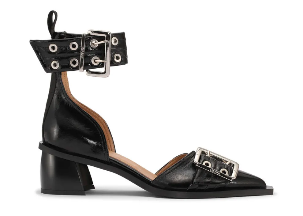 These black chunky buckle open cut pumps are made from a recycled polyester blend. The pumps are designed in an open style and feature large metal buckles with engraved GANNI logos, eyelet details, pull tabs, block heels, pointed toes and elastic details inside the ankle strap to facilitate movement.