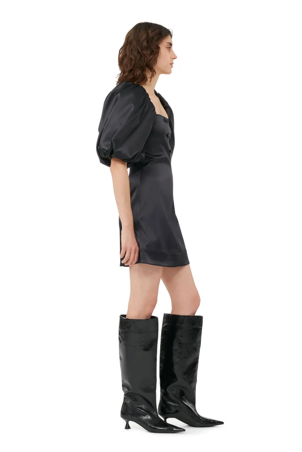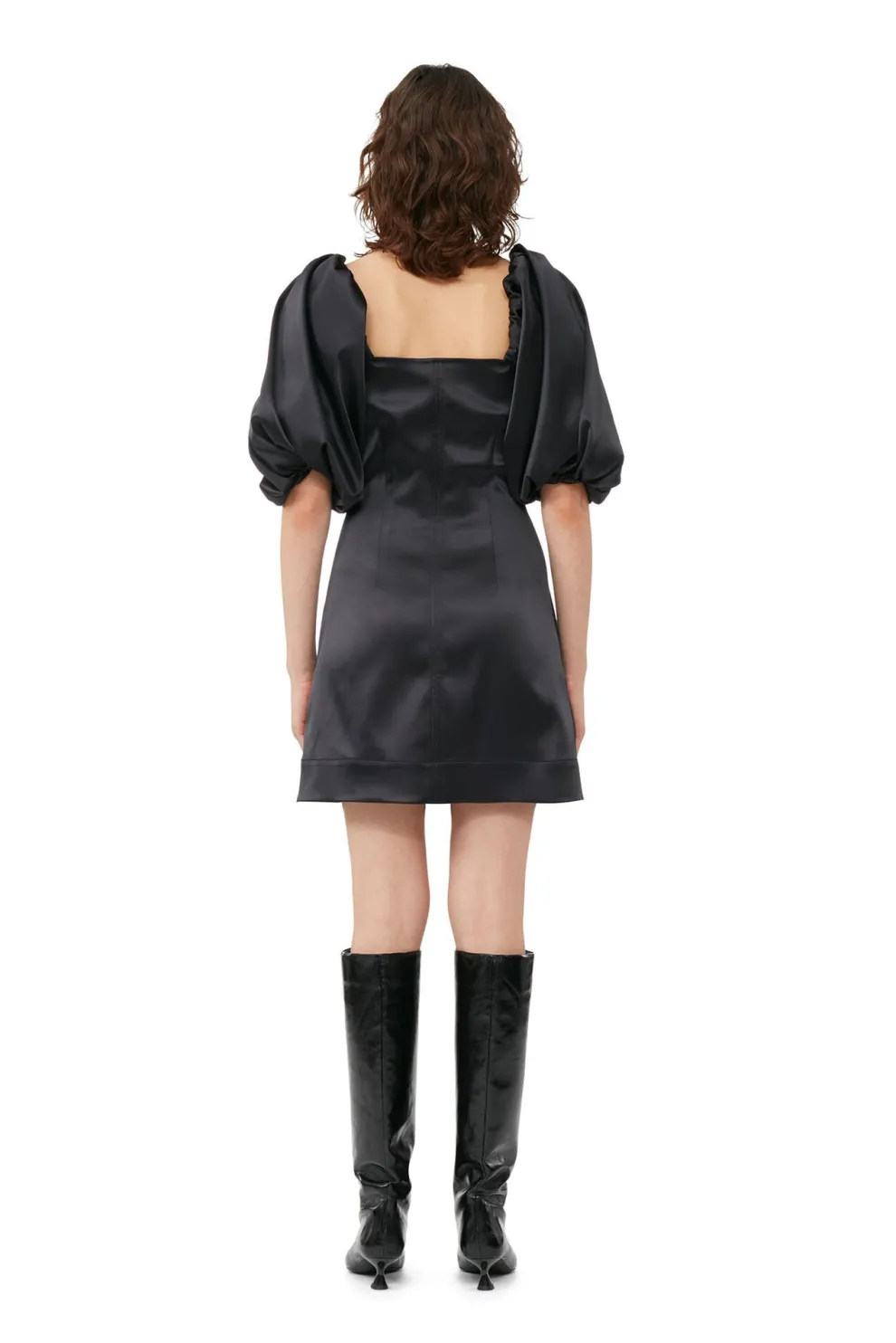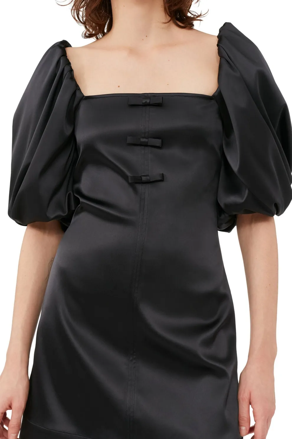 This black satin mini dress is made from recycled polyester and elastane. The dress is designed for a slim fit and features a square neckline, short puff sleeves, decorative bow details to the front and a zip fastening.