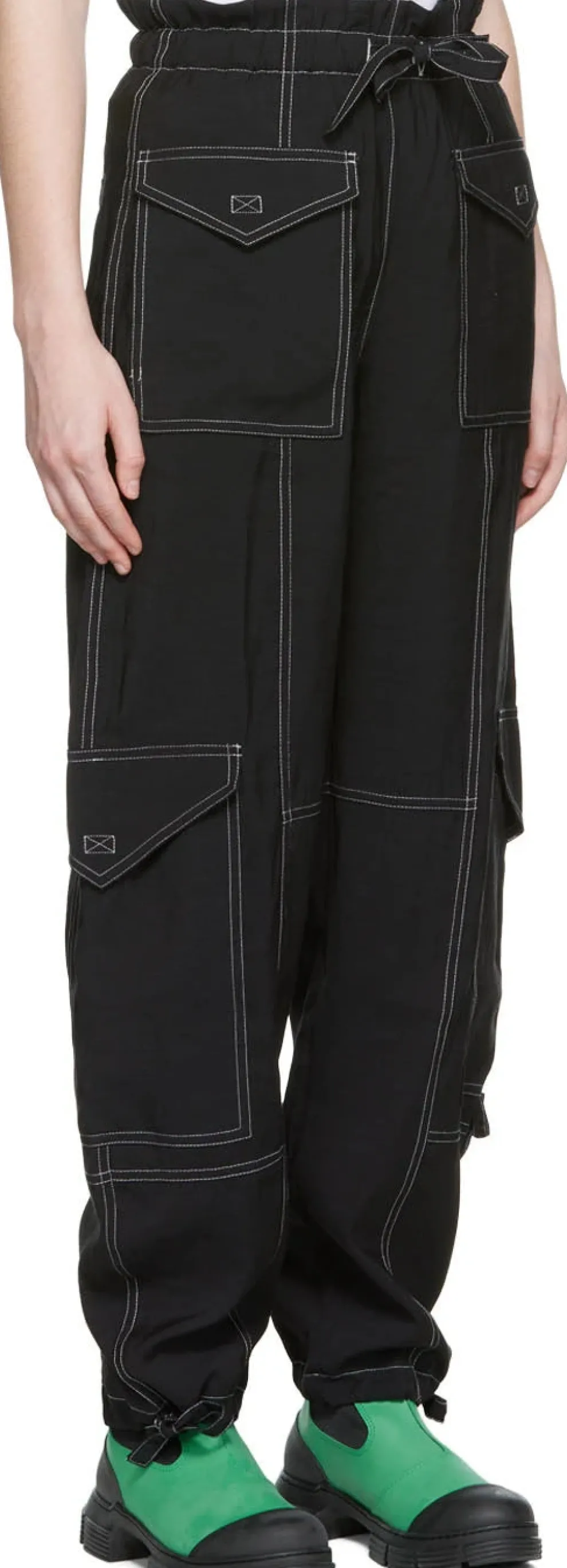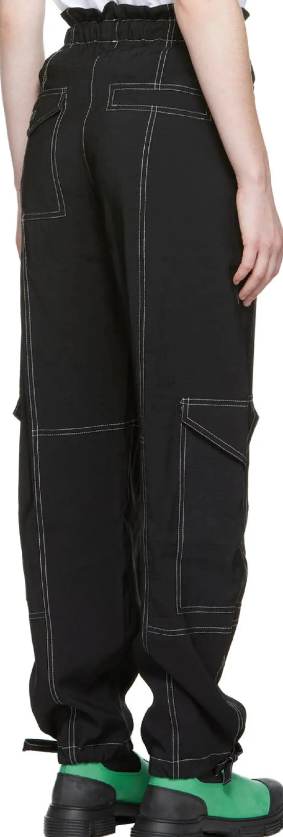In a black colourway, the piece is detailed with multiple pockets and the seams are highlighted with contrasting white stitching.
