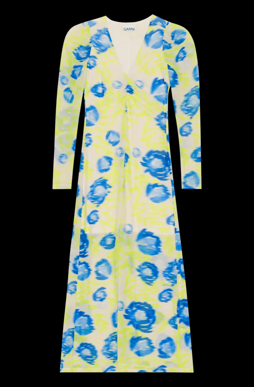 This long mesh dress is A-shaped, with a V-neckline and long sleeves.