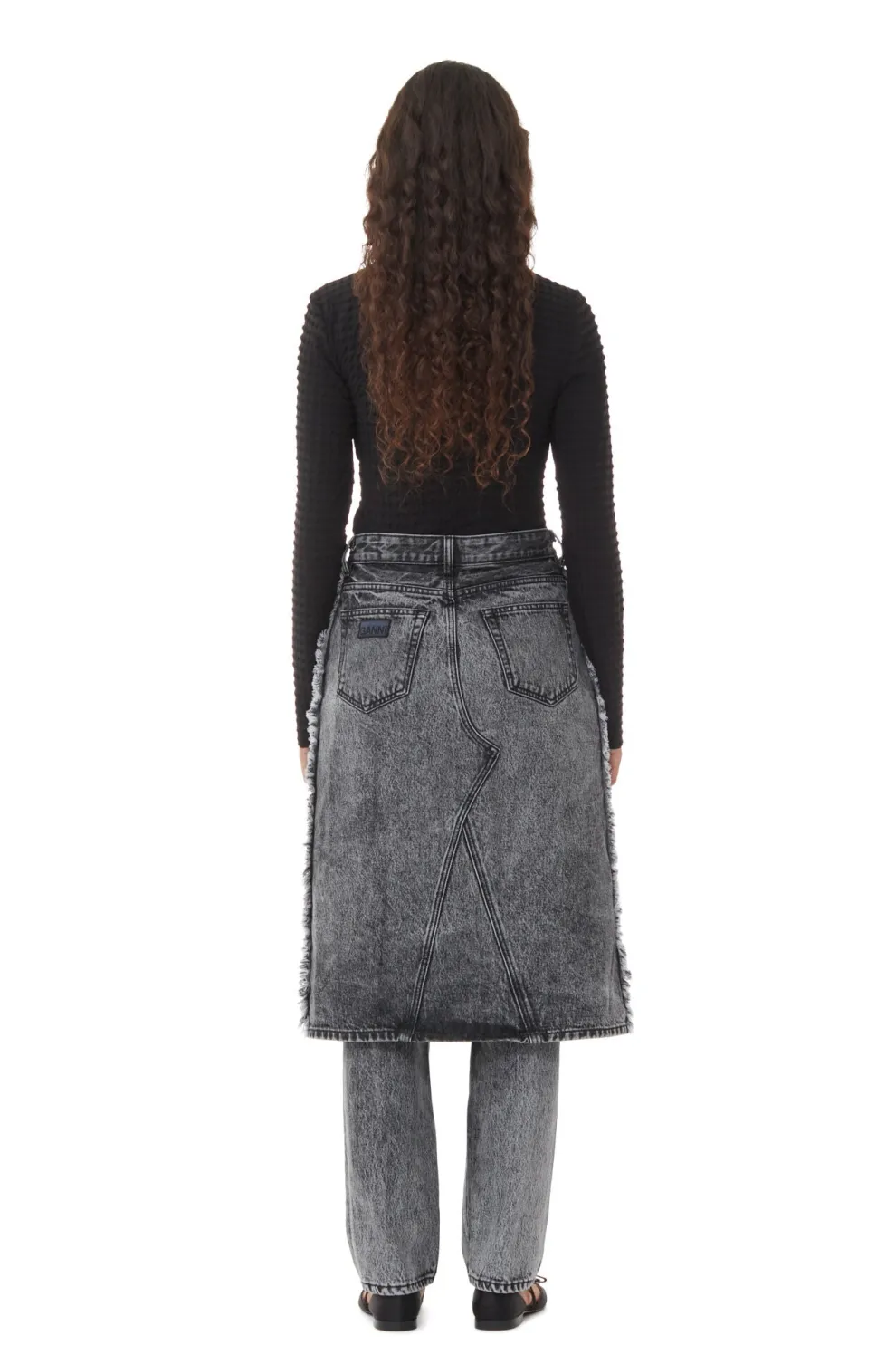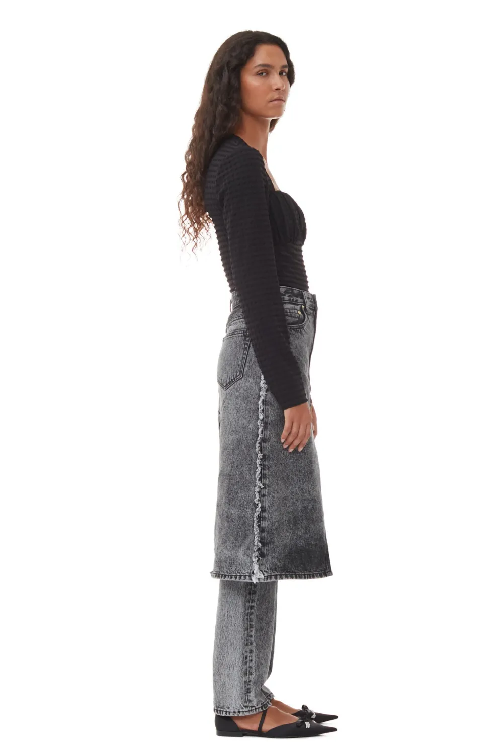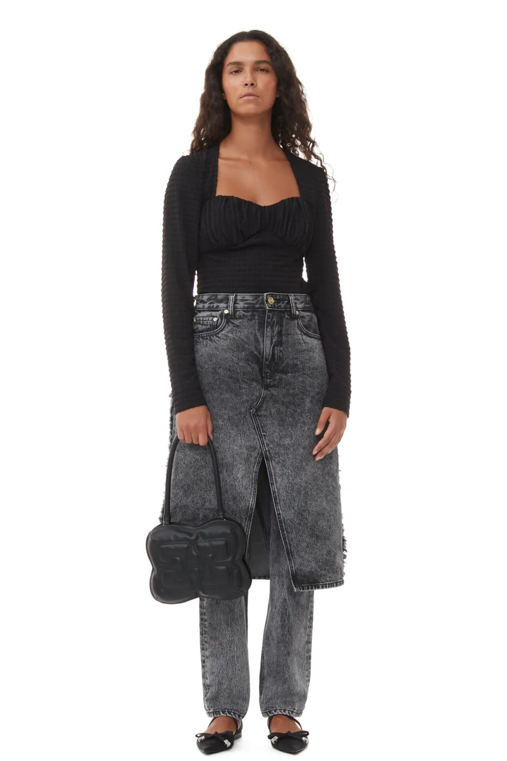 This black stretch seersucker blouse is made from a recycled polyester blend. The blouse is designed for a slim fit and features a sweetheart neckline and long sleeves.