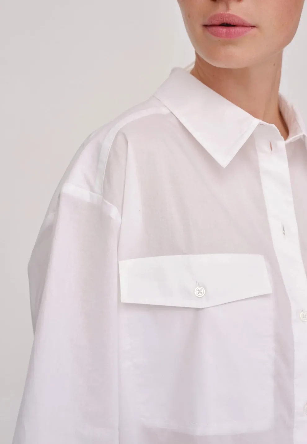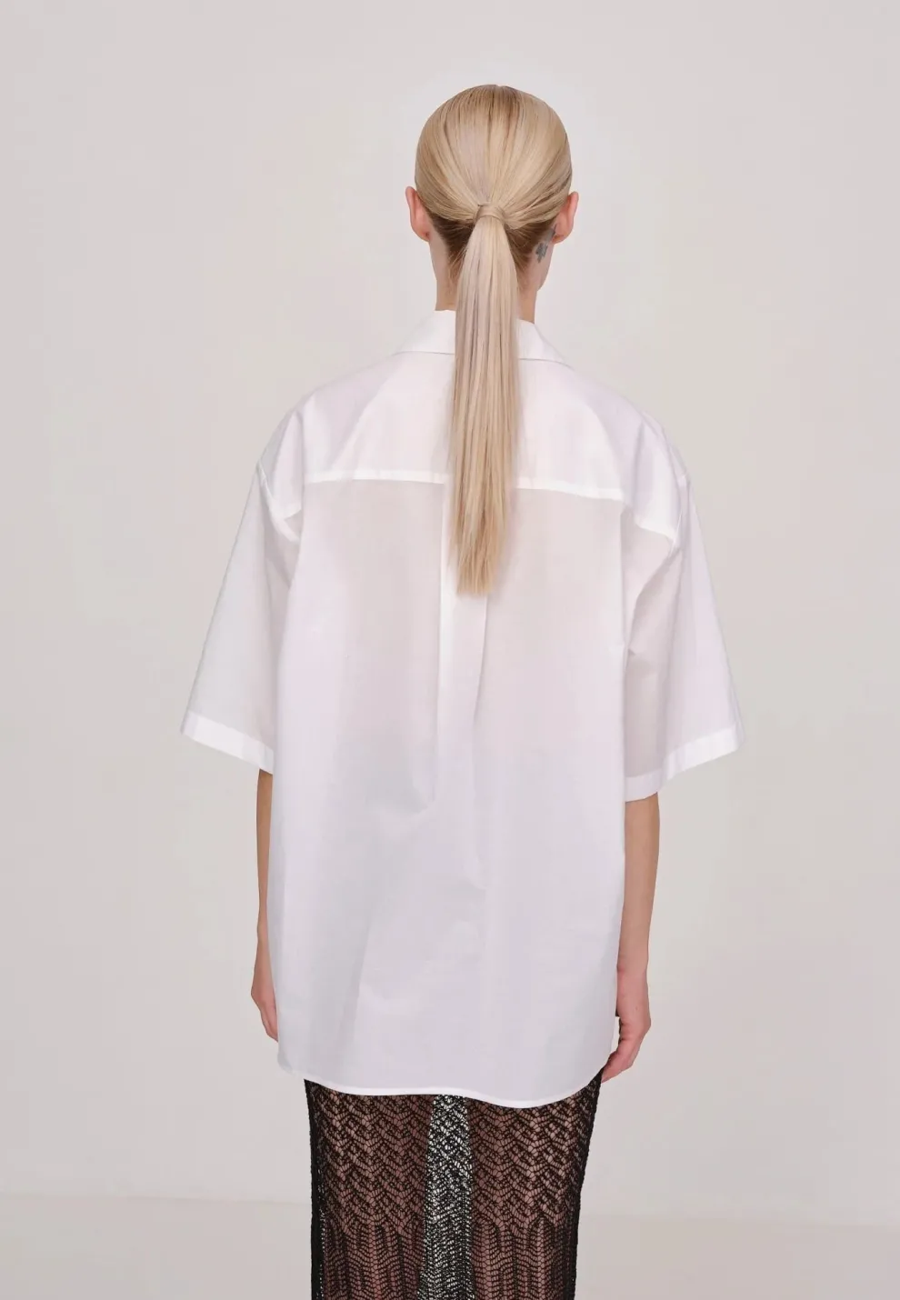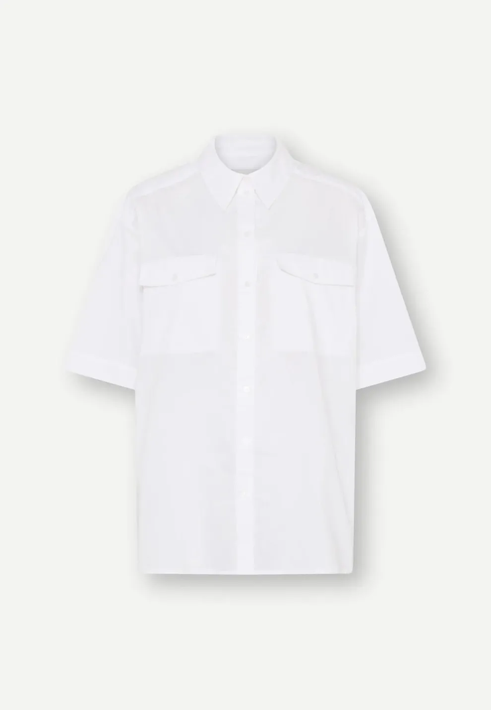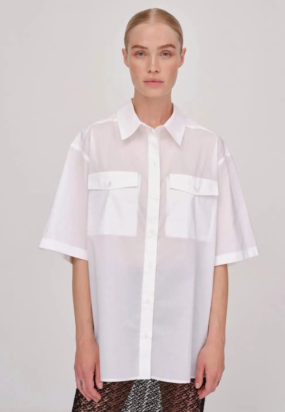 La chemise Helle est une chemise ample avec des manches courtes, des épaules tombantes et des poches plaquées sur la poitrine.