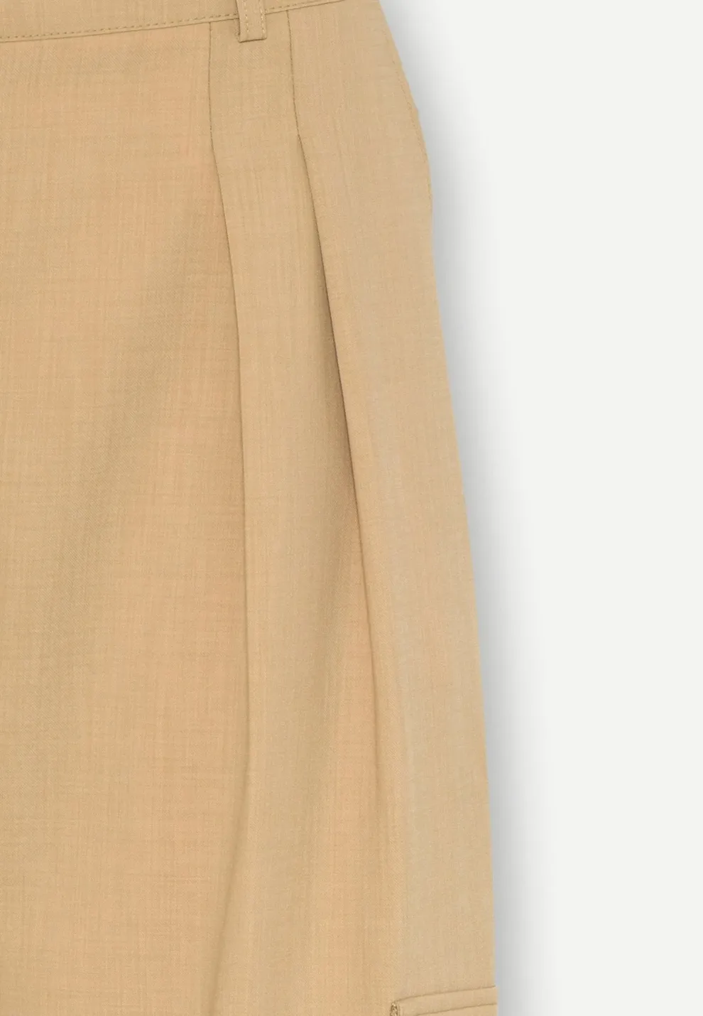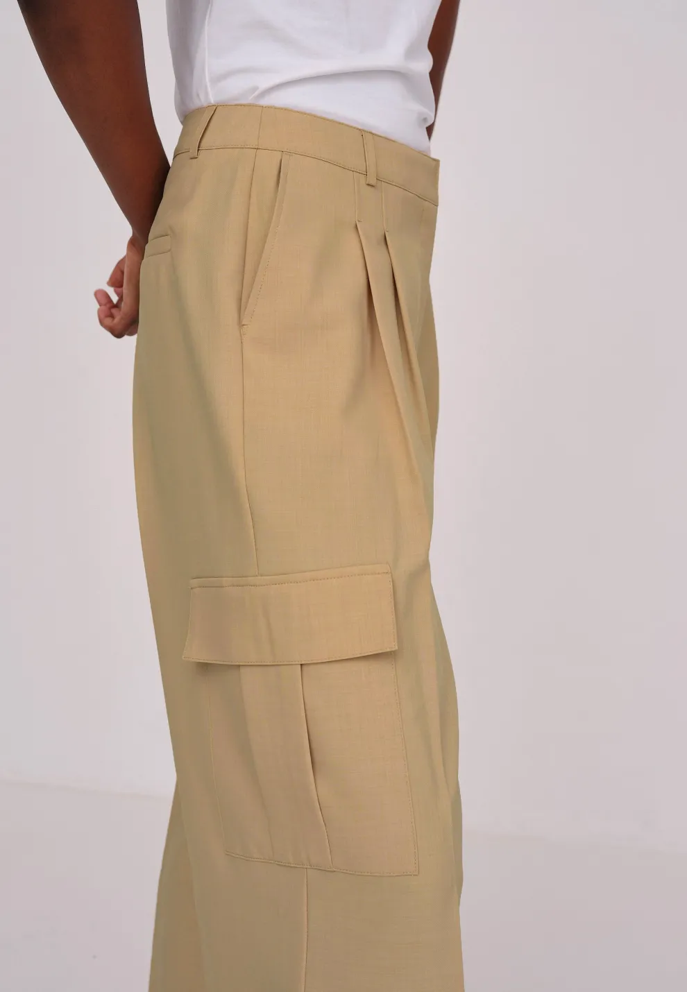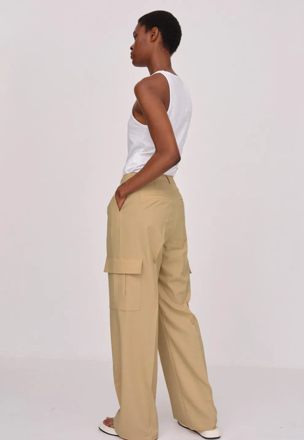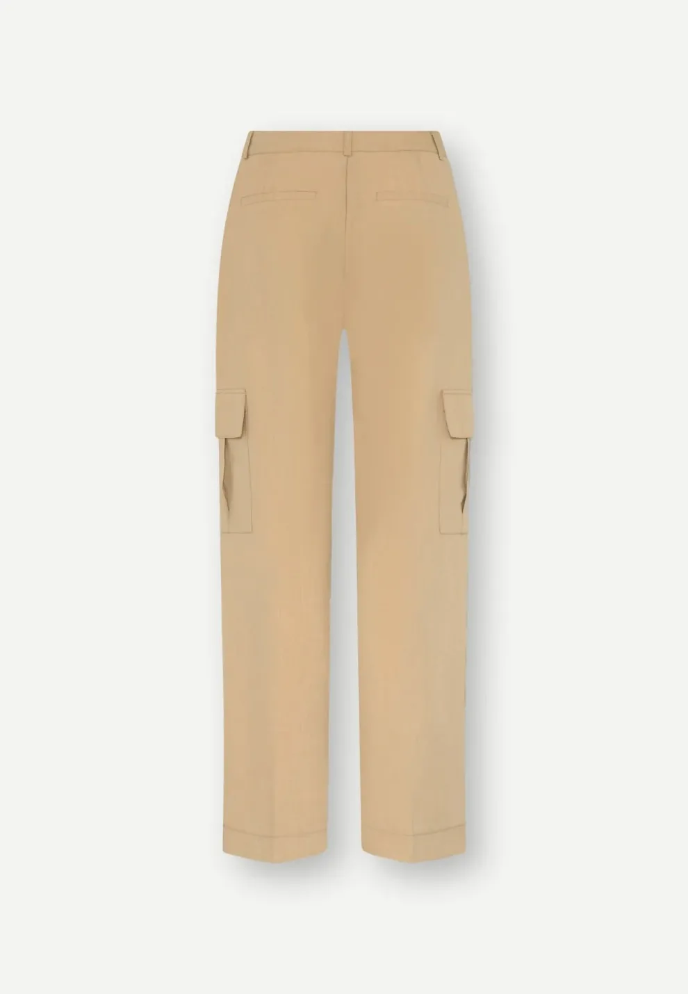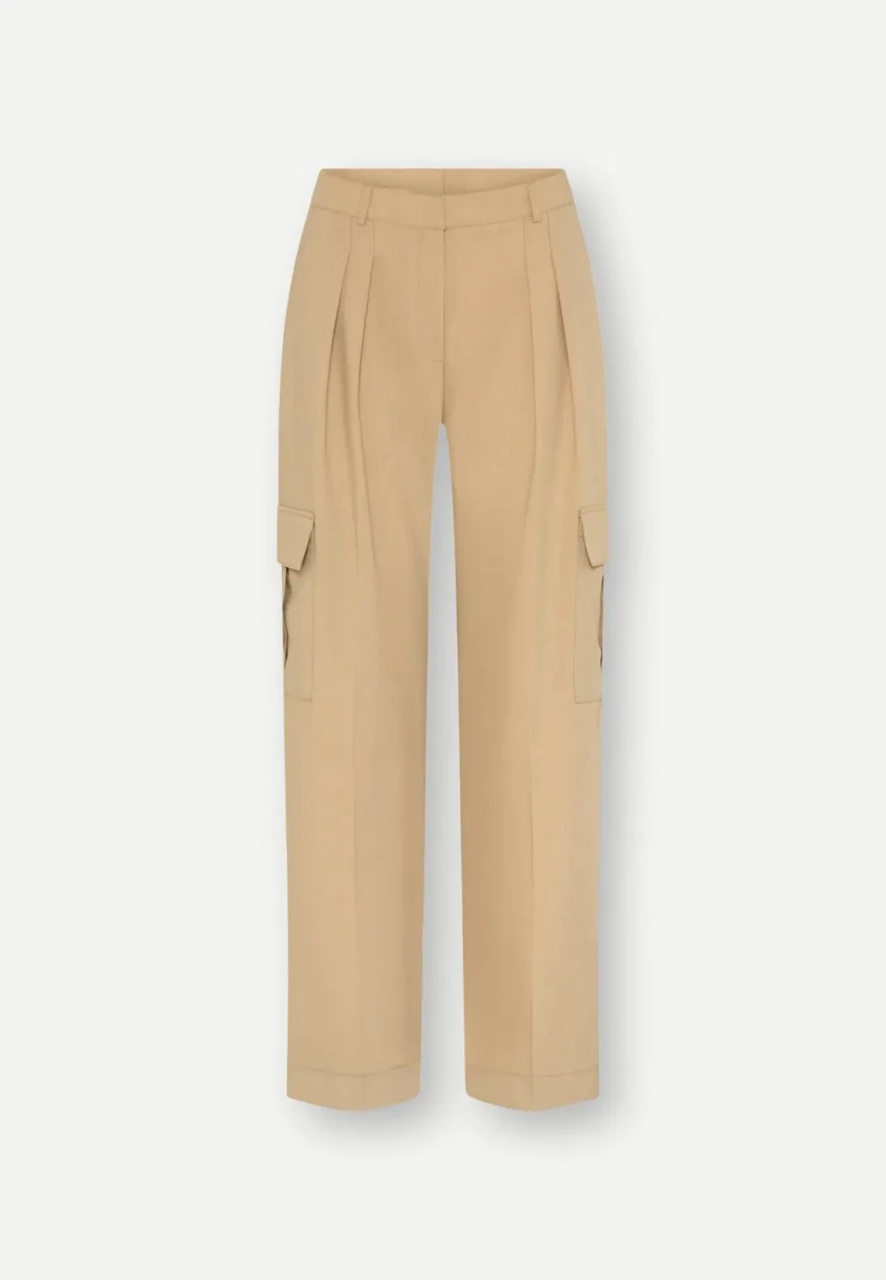 Le pantalon Louise est un pantalon cargo à taille mi-haute avec des détails inspirés des pantalons tailleur. La jambe est droite, il possède un pli à l’avant et deux grandes poches cargo sur le côté.