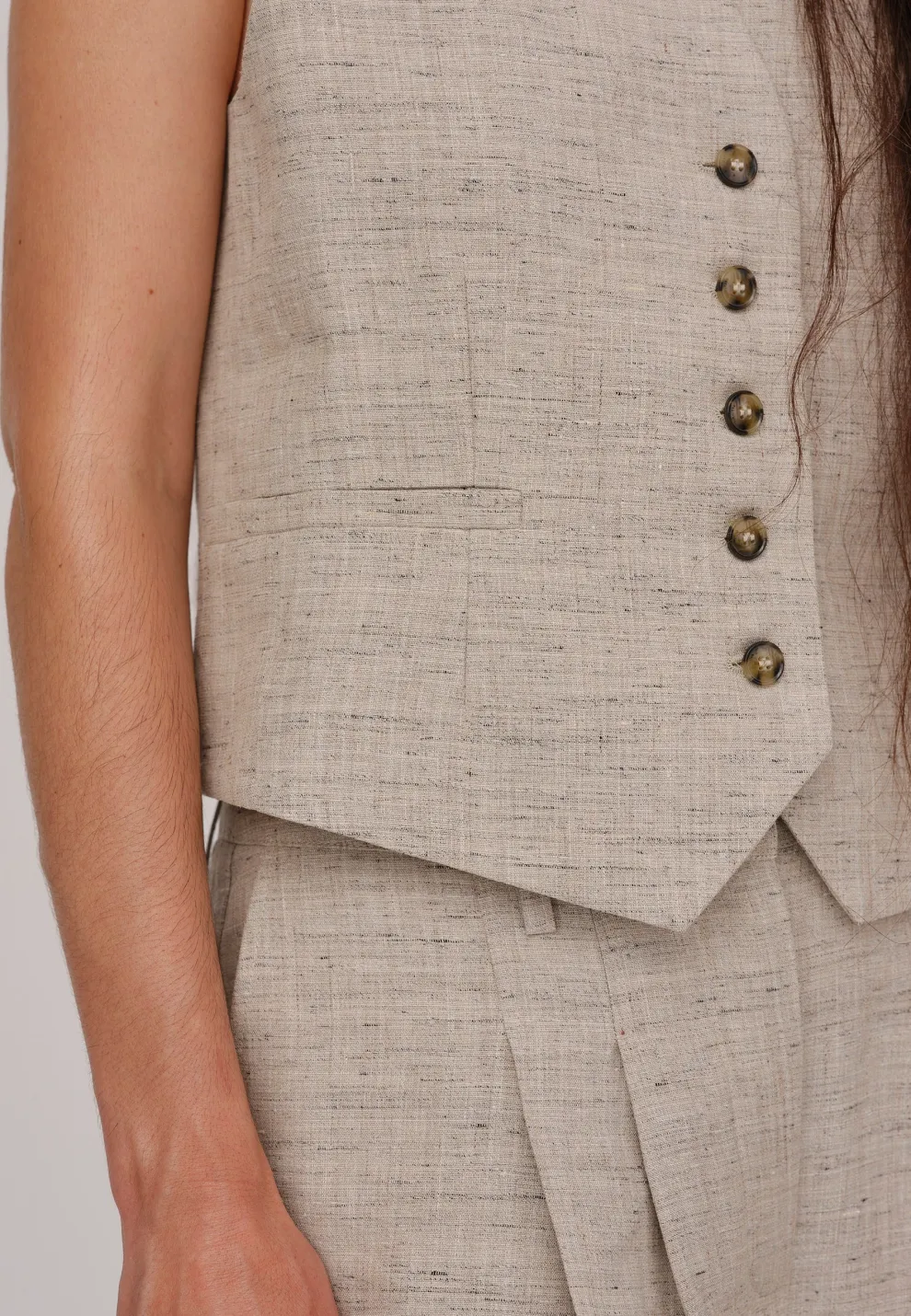 Le veste Mister est un gilet de costume ajusté avec des panneaux latéraux, doté de deux poches passepoilées sur le devant et d’une fermeture à bouton.