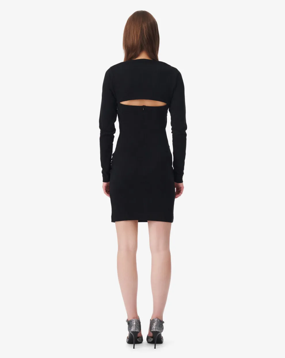 Short jersey dress. A revealing detail at the front. Pleated and draped. Long fitted sleeves. Slim fit. Boat neckline.