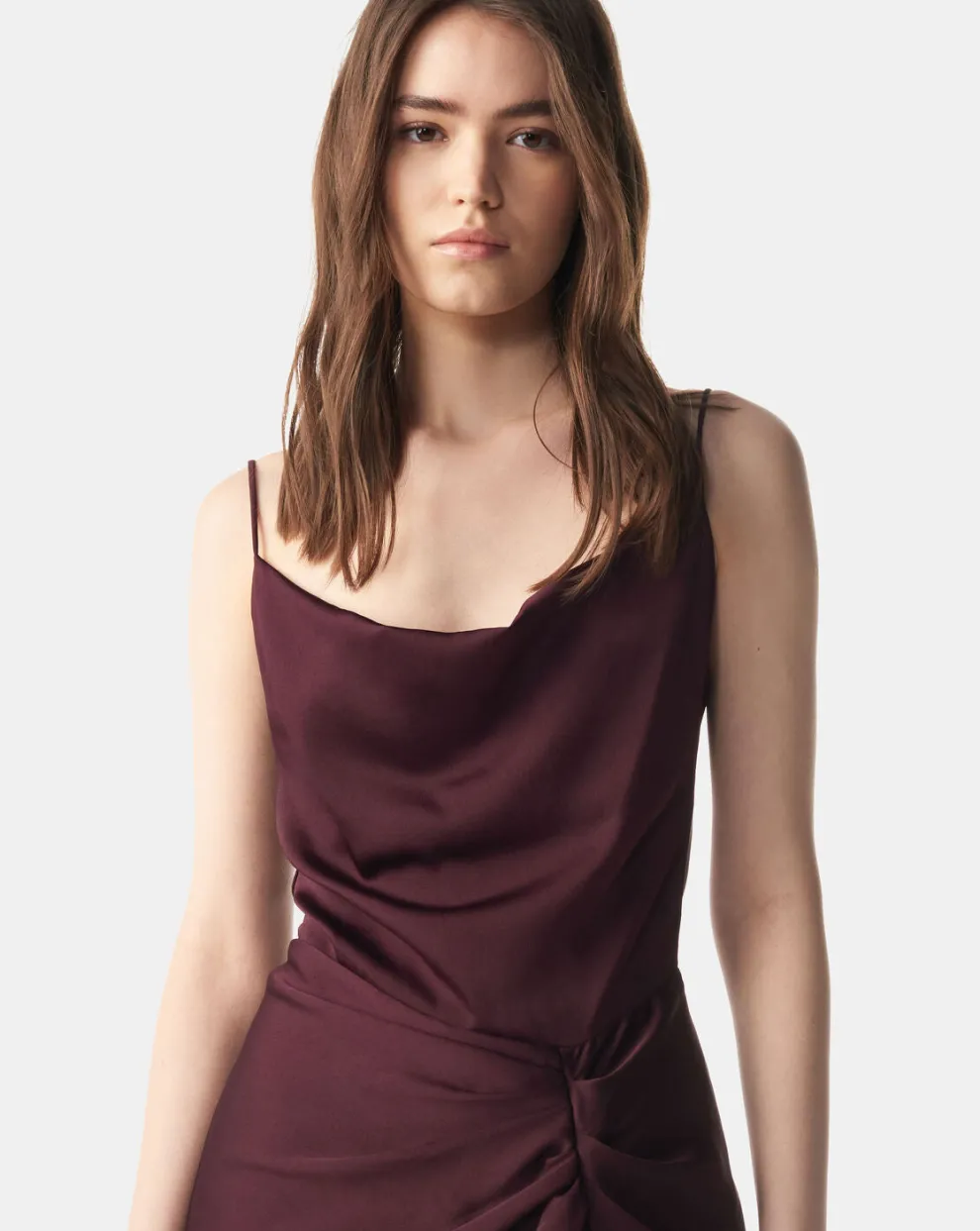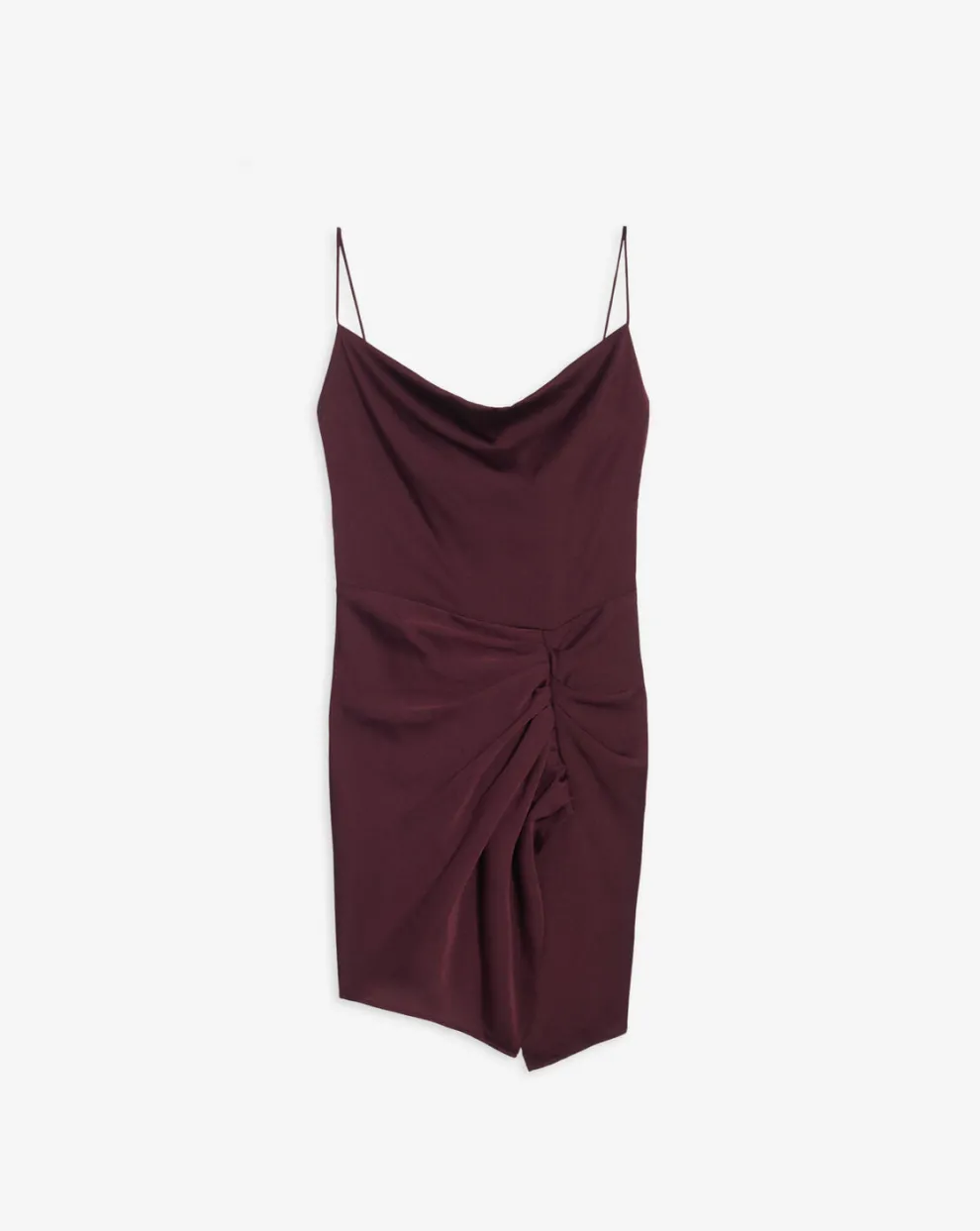 Short dress with thin straps. It has a boat neck, a slit and gather details.