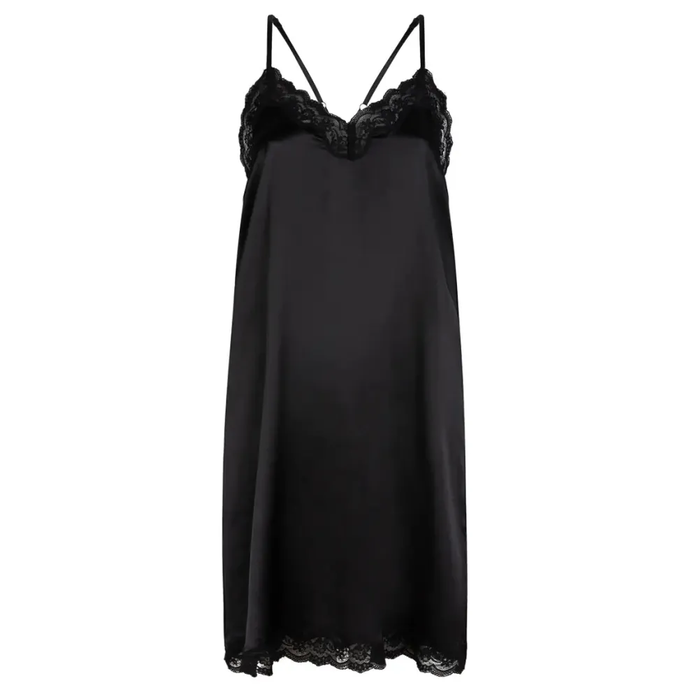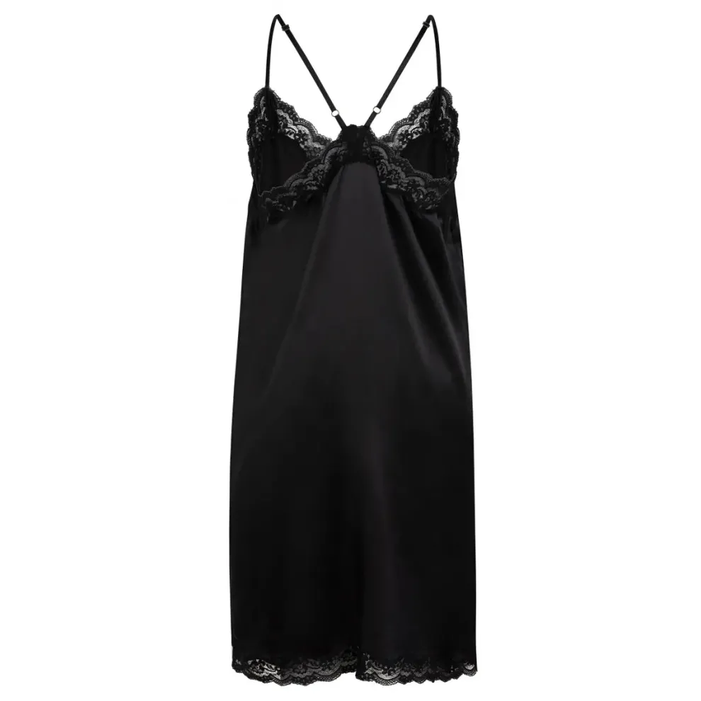 Short dress in black, cut from 100% luxurious silk. Finished with scalloped floral lace trim to the neckline and hem.