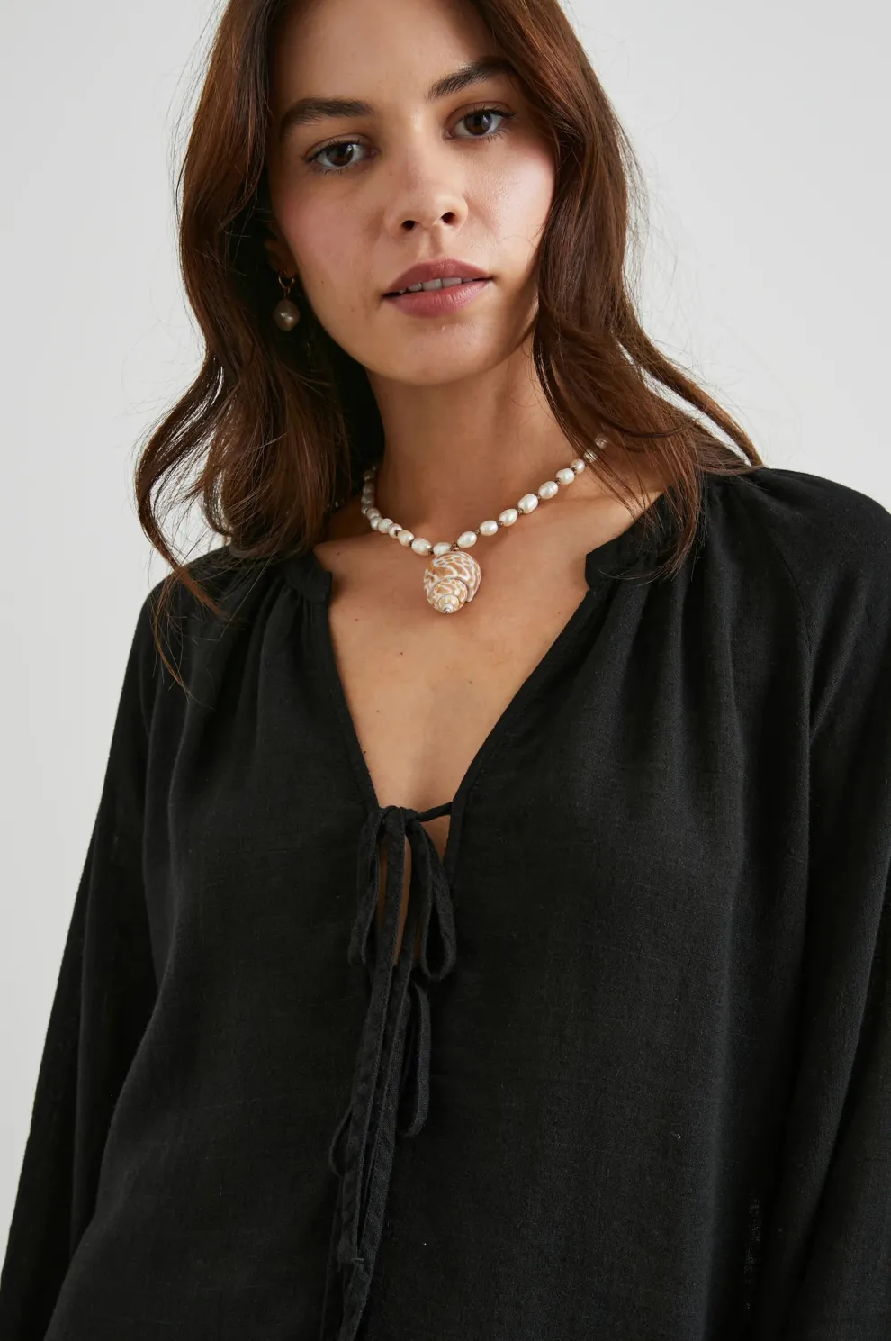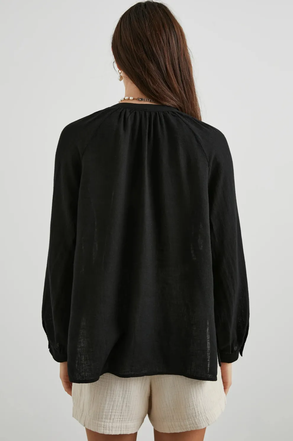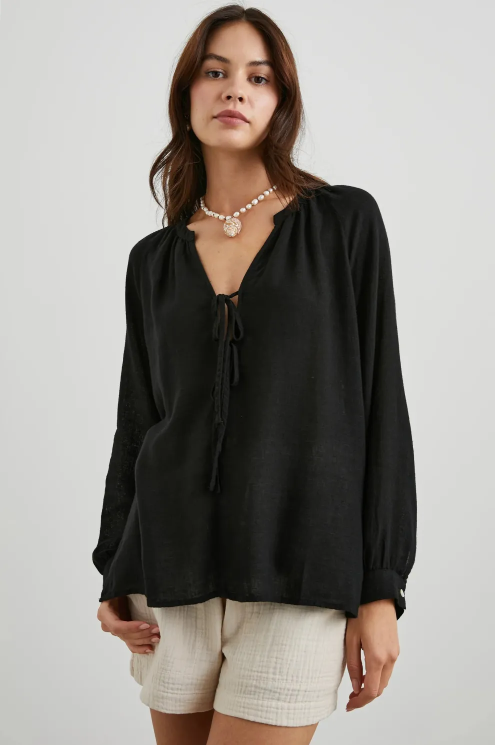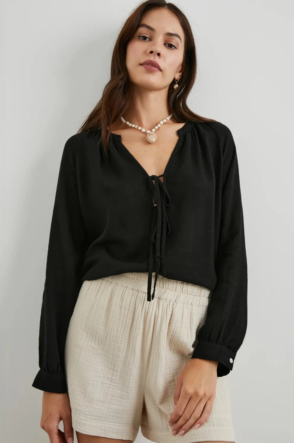 Fabriqué dans un luxueux lin léger, le haut Brielle est parfait pour les journées chaudes. Ce haut à manches longues présente une manche raglan et un col en V avec des liens ajustables.