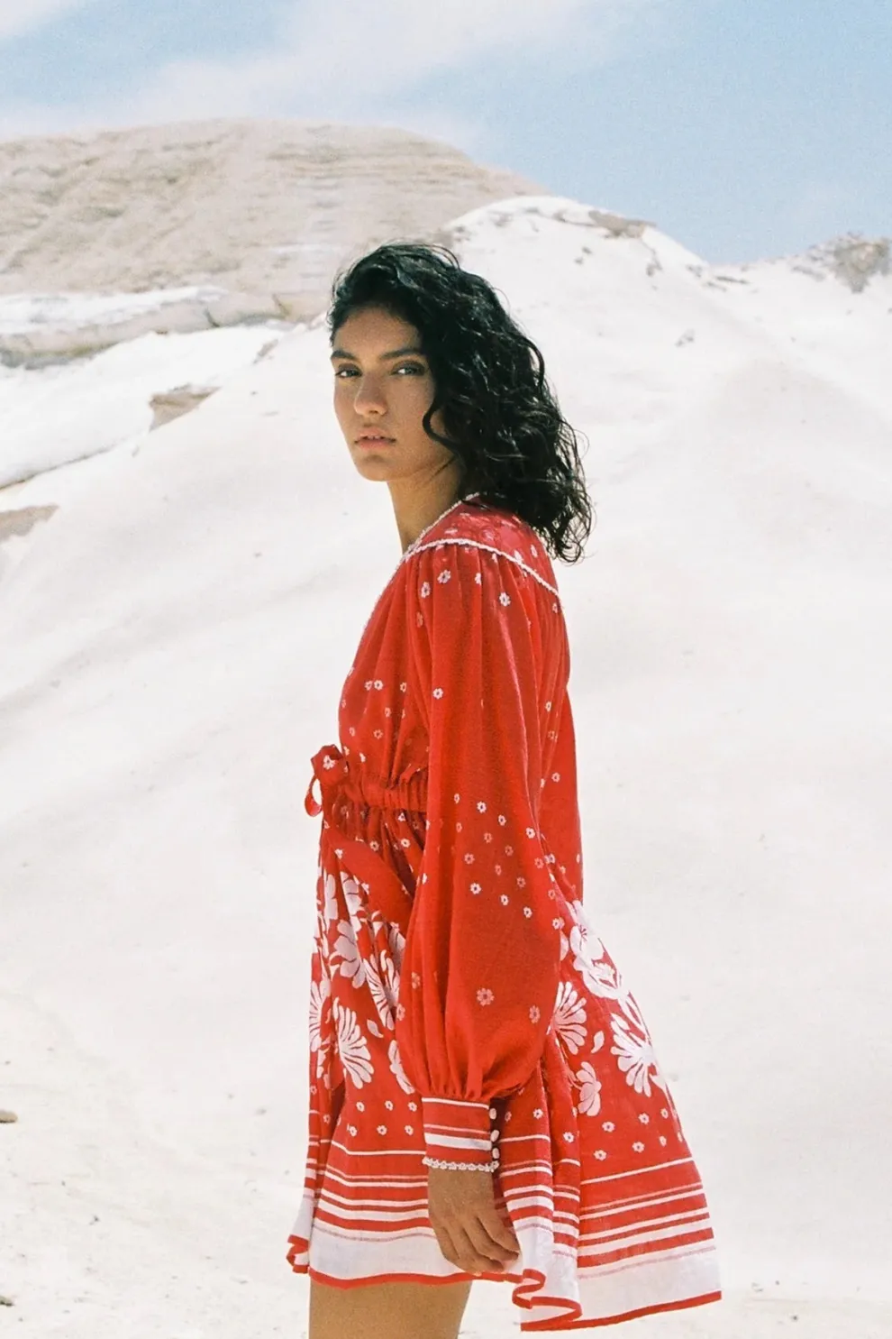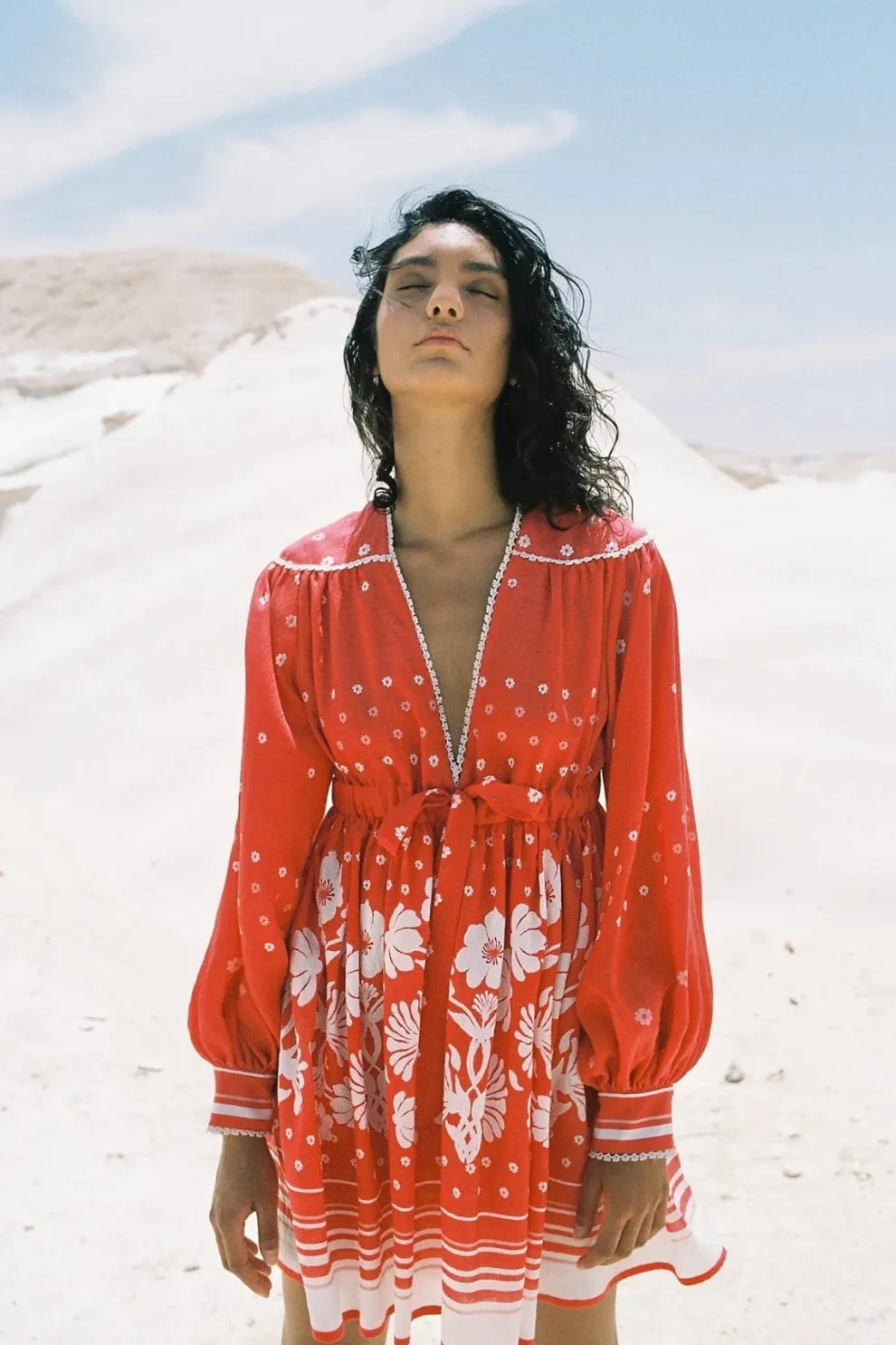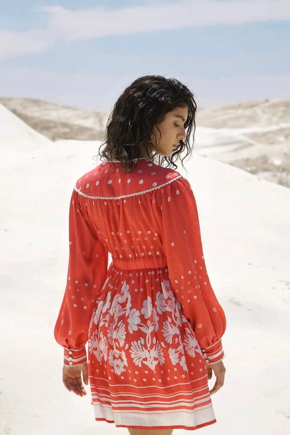 La mini robe à imprimé fleuri Nana possède une encolure en V et une corde à nouer à la taille. Ses manches sont longues avec des revers.