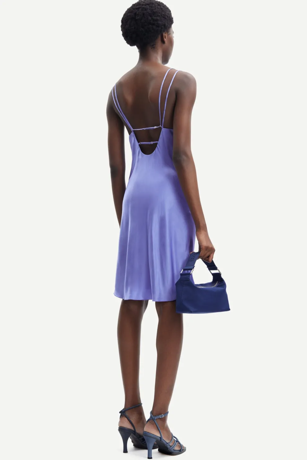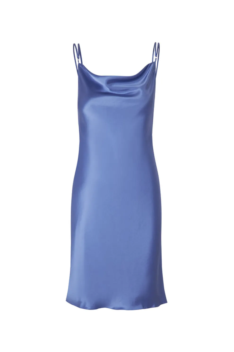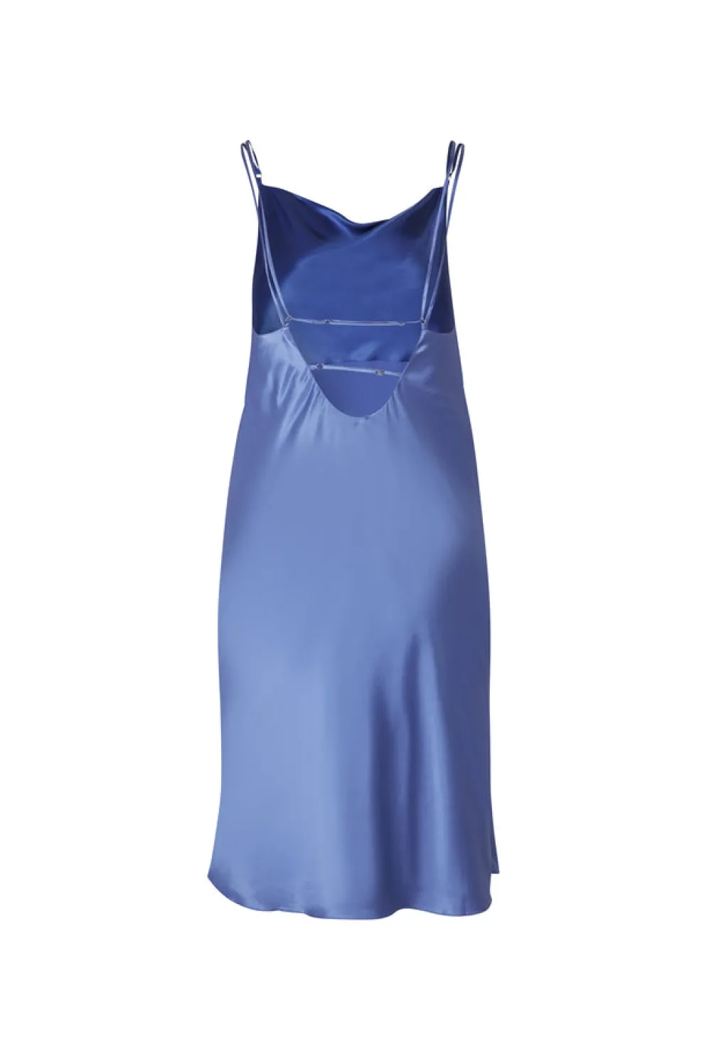 Midi dress with fitted straps featuring a draped waterfall front neckline and a low back. Adjustable straps. A front cut viscose and silk blend fabric derived from fibers of roses, this dress continues to smell of roses even after washing.