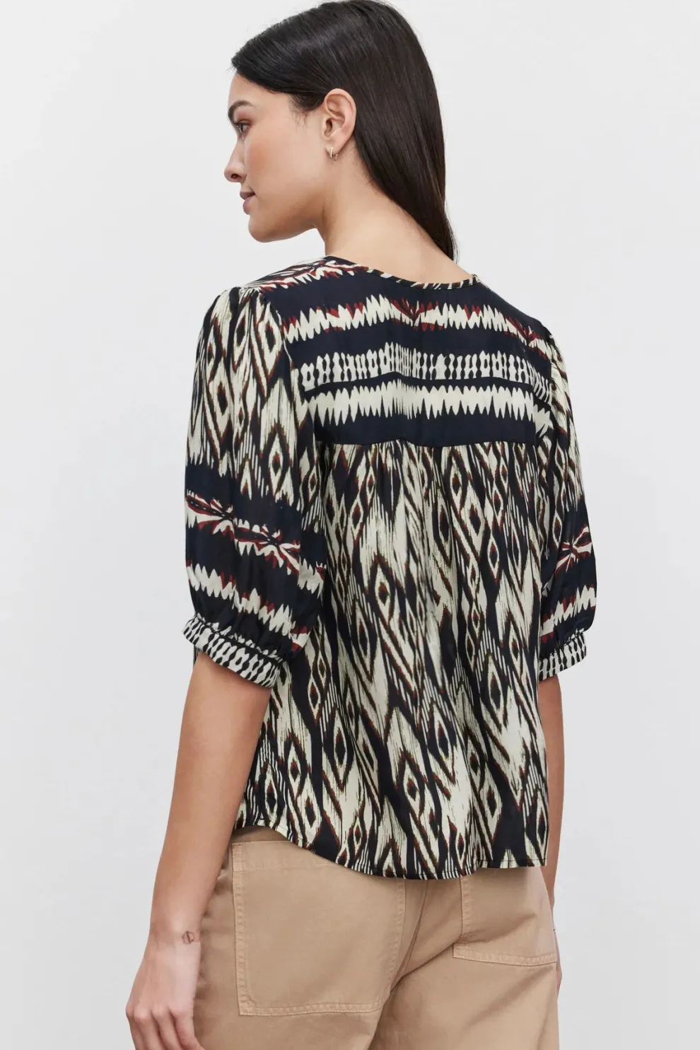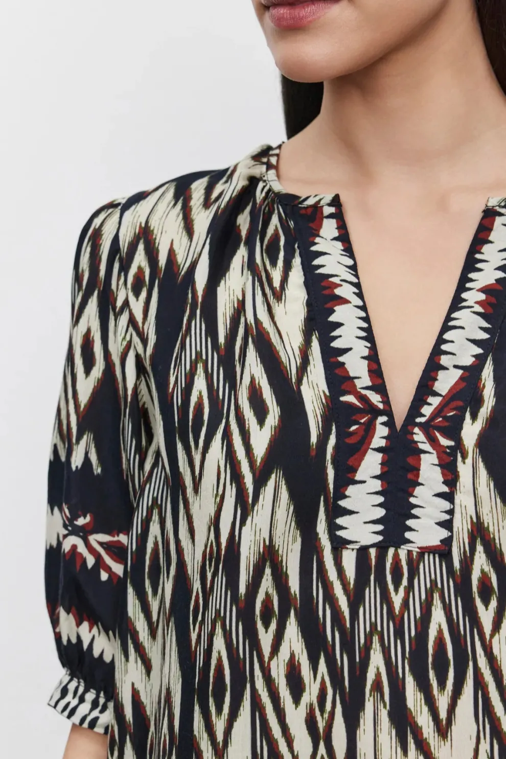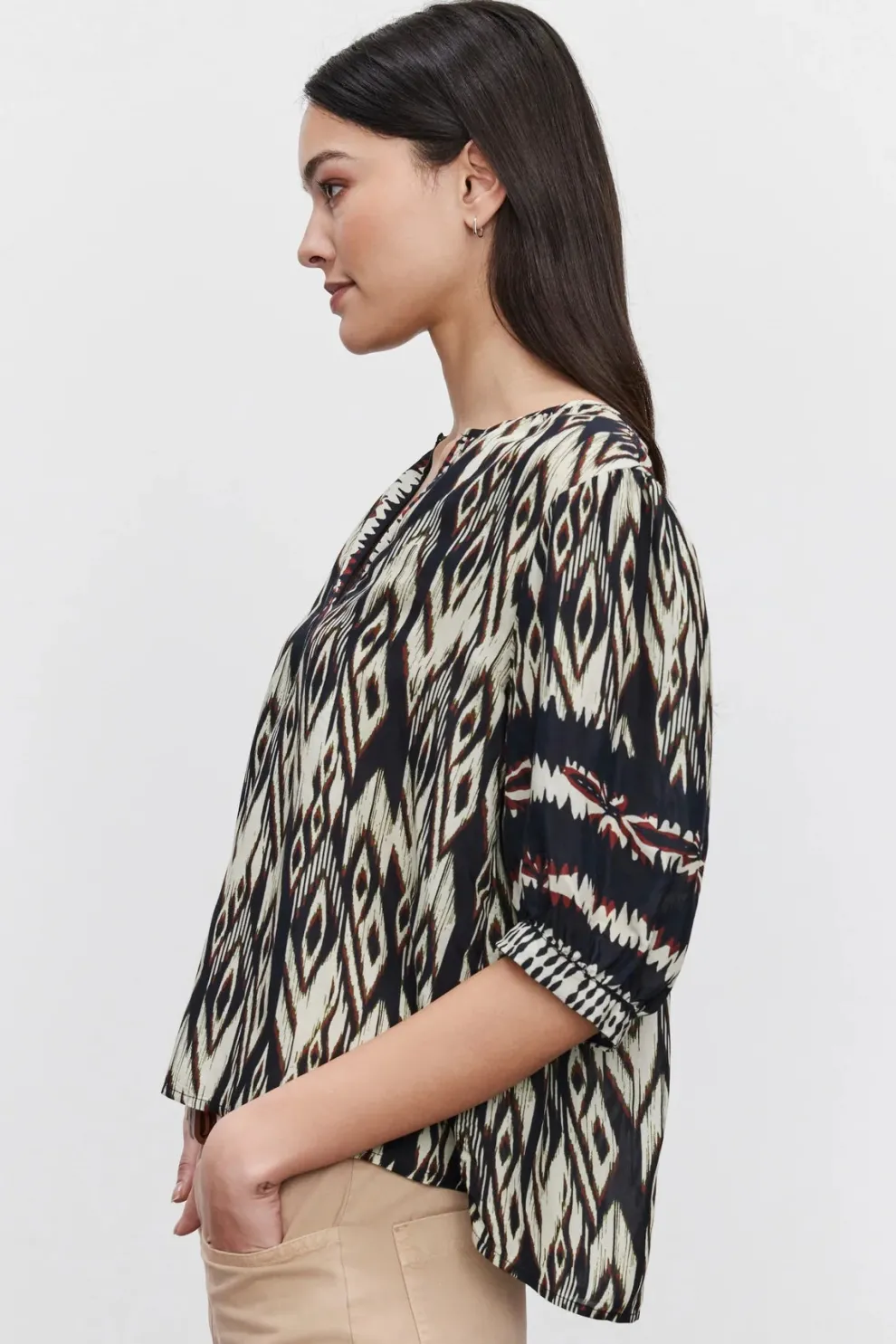 Rafraîchissez votre garde-robe avec le haut Beatrice, arborant un magnifique imprimé ikat sur de la viscose luxueuse. Conçu avec un col fendu et des poignets à bande, il offre un look chic avec une coupe ample et décontractée.