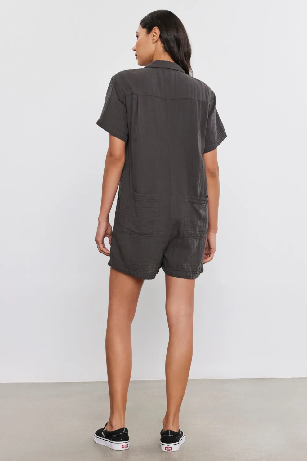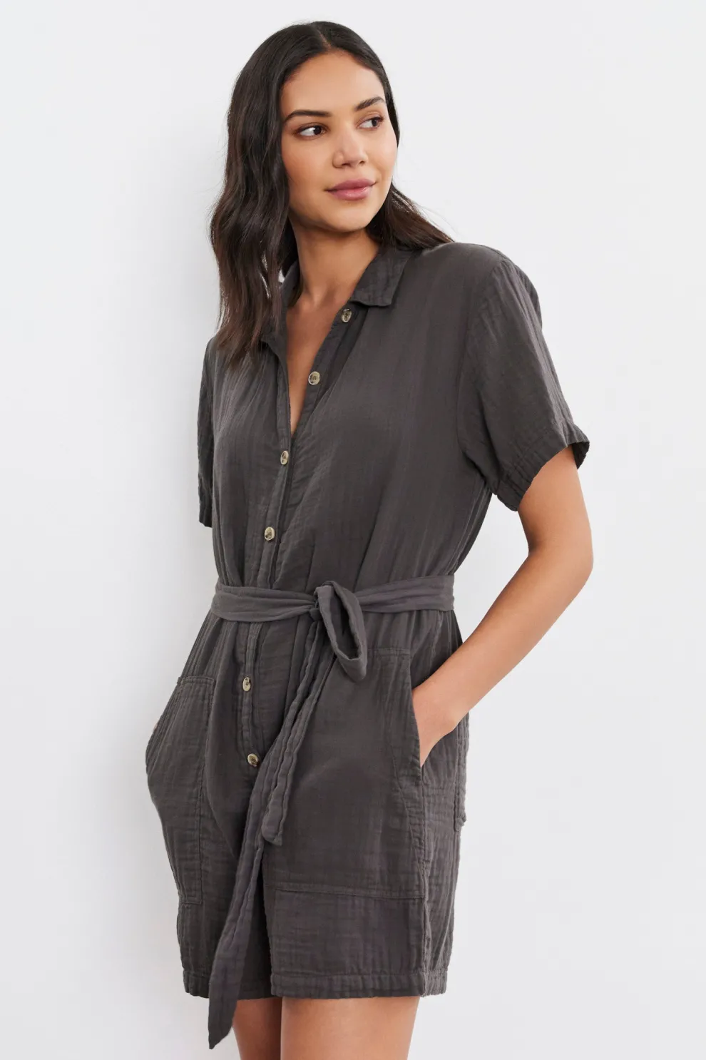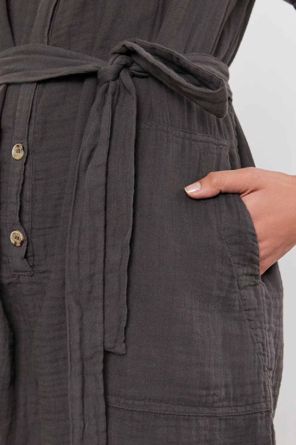 La combinaison en coton Dane présente une patte de boutonnage, une ceinture à la taille, des manches courtes, ainsi que des poches profondes à l’avant.