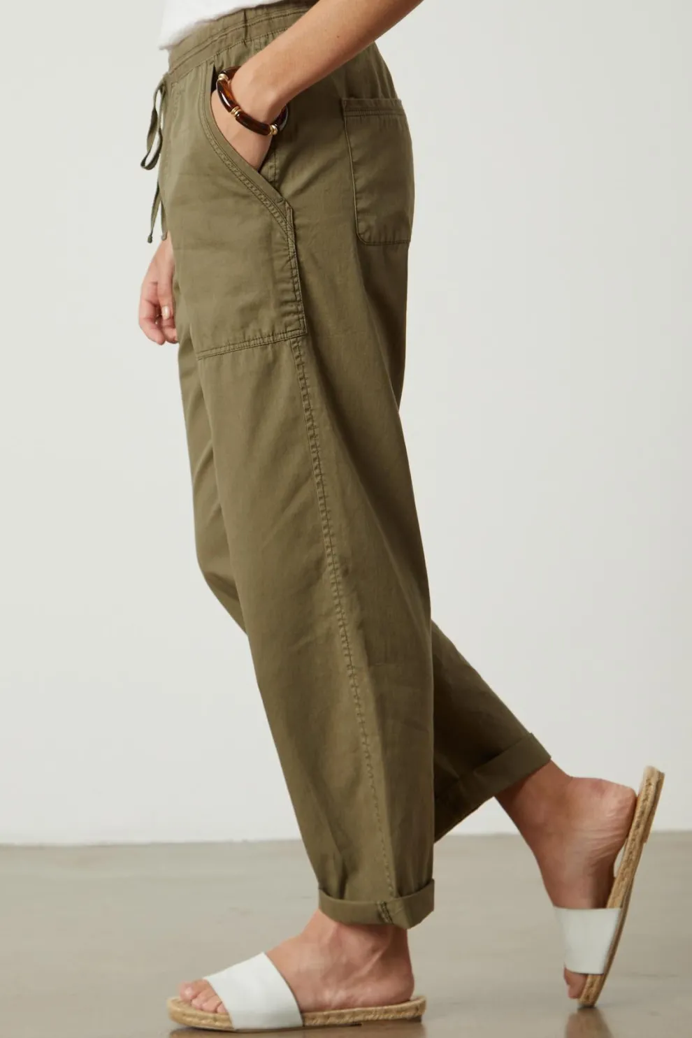 Le pantalon Misty est fabriqué à partir d’un coton tissé doux. Il possède une taille élastique avec cordon de serrage et présente une jambe décontractée avec un ourlet légèrement raccourci. Les poches de devant sont fendues sur les hanches et les poches à l’arrière sont plaquées. N’hésitez pas à retrousser pour un look plus décontracté.